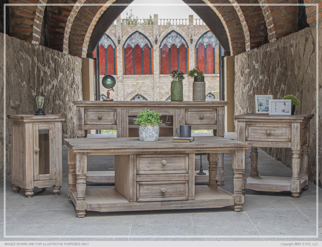 | Featured-2 | Featuring mango and pine wood. Multi-step, lacquer Sand Drift finish protects the intrinsically wire-brushed wood. Mortise and tenon construction offer stability and durability. Hand-turned legs add a beautiful farmhouse look. English dovetailing on 100% solid wood drawer fronts. Ball-bearing metal glides offer superior stability and smooth glide to drawers. Hidden casters on cocktail table facilitate mobility. Includes four storage drawers (two on each side). Sturdy open shelves provide extra storage and display space. Sofa table features one fixed shelf behind glass doors. | |
