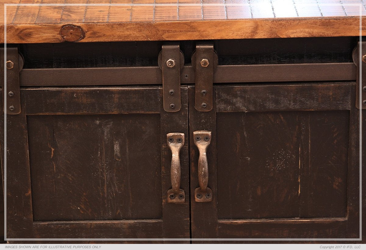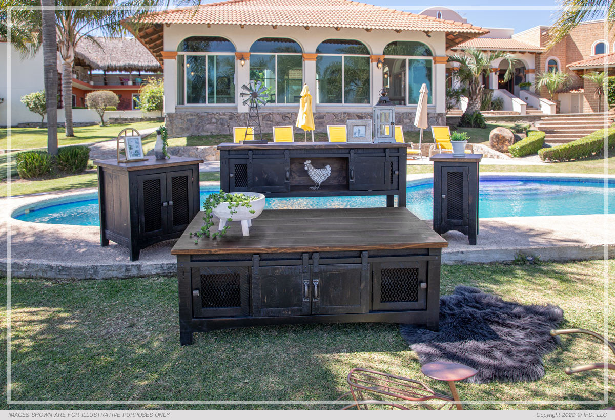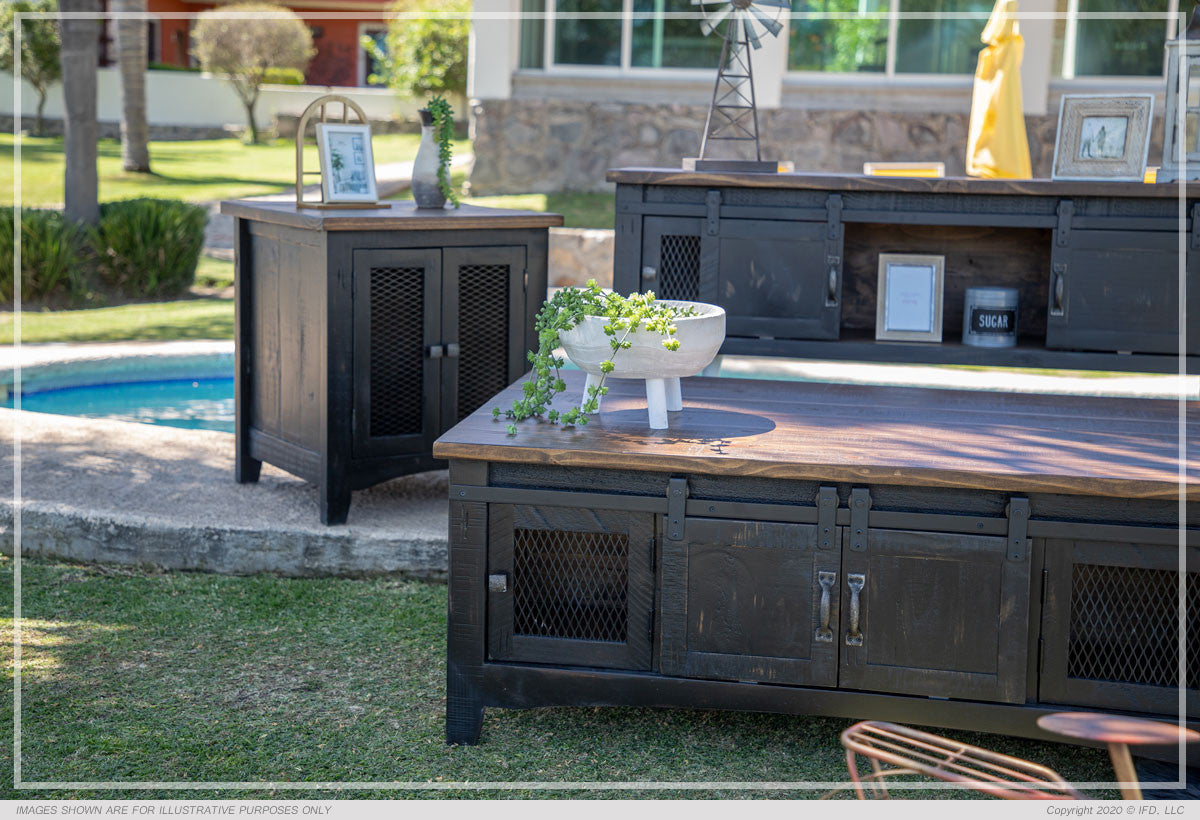 | Featured-2 | · Featuring 100% solid pine.· Multi step Black finish on distressed wood. Tops feature a medium brown stain that provides depth and character to solid pine.· Solid tops are floated to allow for woods natural movement.· Barn doors with functional rolling mechanism add a unique look.· Side doors feature metal mesh on panels add rustic industrial appeal. | |