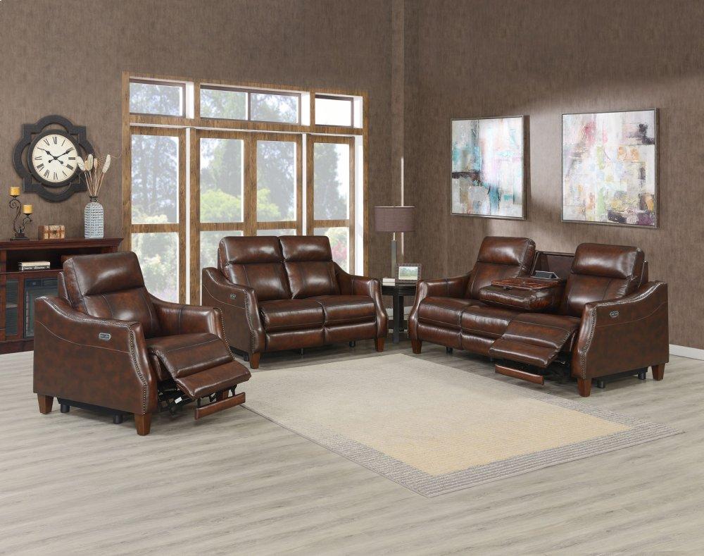 Stylish enough for an old English library yet comfortable enough for the big game, the Akari leather dual power reclining group brings a new charm to your favorite recliner. Hand-burnished English chestnut leather appoints all seating areas, accented by nailhead trim. The reclining sofa features a drop-down console with a USB charging station and dual cupholders.