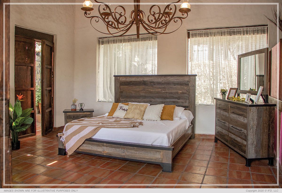 | Featured-2 | Solid pine constructionSix-step, hand-painted finish in gray and brown tones for a "reclaimed wood" look (* Same finish as 6441 Loft Collection)Mortise and tenon construction ensure stability and durabilityMicrofiber-lined top drawers on Dresser and NightstandWrought-iron pullsTop trim features hand-wrought iron in a streamlined styling. Legs and base also feature authentic wrought iron for an authentic rustic look and added valueEnglish dovetail joinery on solid wood drawer frontsBall-bearing Hafele metal glides offer superior stability and a smooth glide to drawersAvailable in Queen, Eastern King and California King Sizes.Requires box spring | |