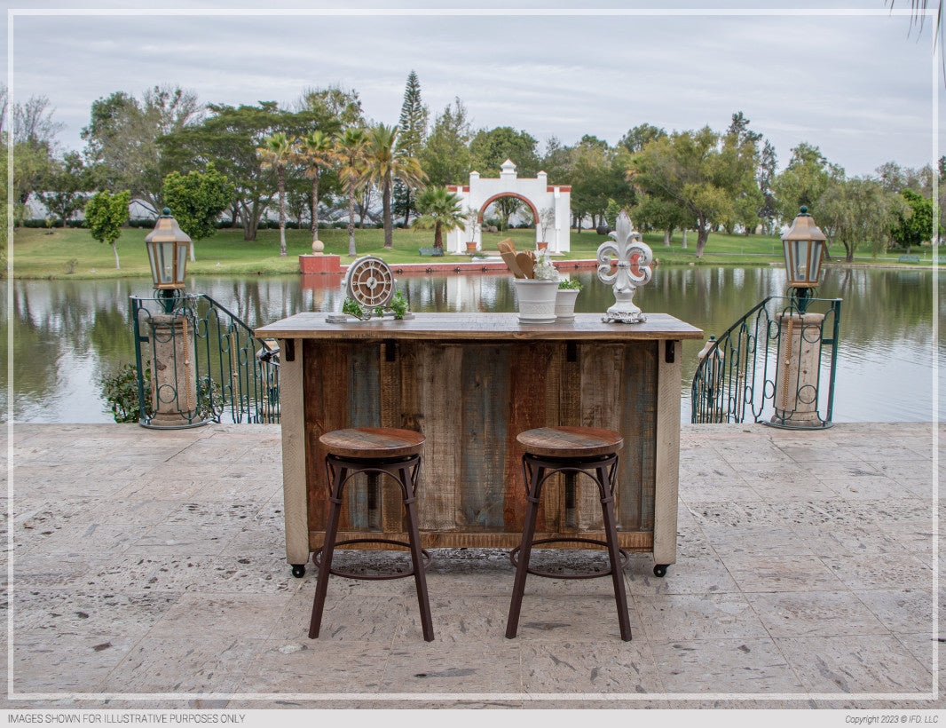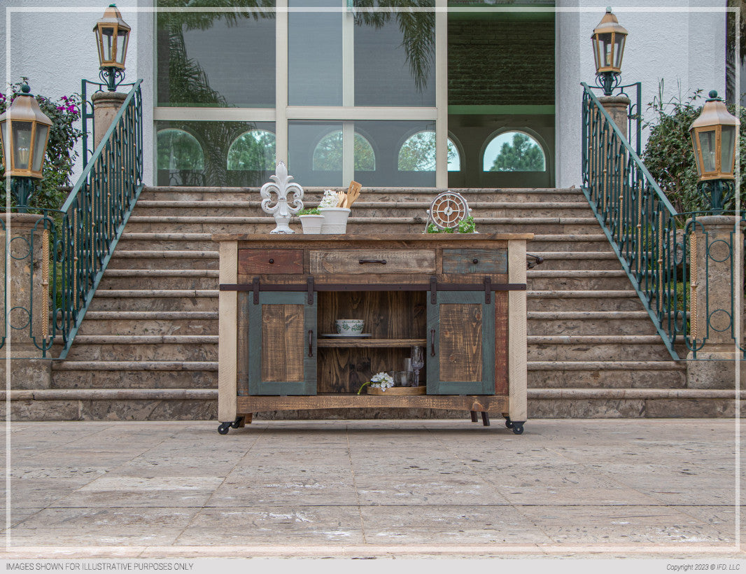 | Featured-2 | The antique collection is meticulously crafted from solid pine wood, featuring a captivating hand-distressed look in a multicolor finish. This collection serves as the perfect rustic addition to your home.Crafted of solid pine wood and engineered wood on the tops to prevent seasonal cracks.Multicolor striped distressed finish on hand-brushed wood. All tops are smooth and soft to the touch. Mortise and tenon construction offer stability and durability. Three drawers with metal pulls. English dovetailing on 100% solid wood drawer fronts with Hafele full-extension steel glides. Two sliding barn-style doors offer convenience and rustic appeal. Four iron mesh doors with magnetic catches. Hand-wrought iron pulls with non-chip finish in matte black. Features towel hanger, and top overhung on one side to double as counter height meal server. Casters for easy mobilityPair it with our adjustable swivel stool, IFD968BS2430, for a perfect match. | |
