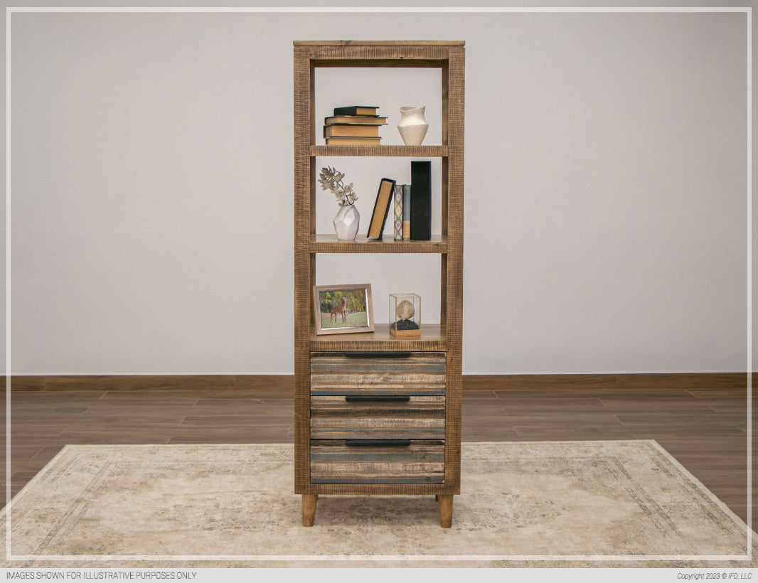 | Featured-2 | The Tiza Bookcase has a classic and sleek design with a simple shape. It is functional with three drawers and open shelves, making it perfect for your office. It is also versatile enough to use in your living room and can be combined with other consoles from this collection to create a wall unit.Solid pine, great durability, and value.Multi-step lacquer in a soft multicolored hand-distressed finish with blue highlights.Mortise and tenon joinery on solid wood frames ensure stability and durability.Engineered multi-ply top and boards.100% solid wood drawers fronts and feature English dovetailing for added strength. The Hafele drawer glides provide a durable and smooth glide.Mix and Match with IFD1981 Consoles. | |