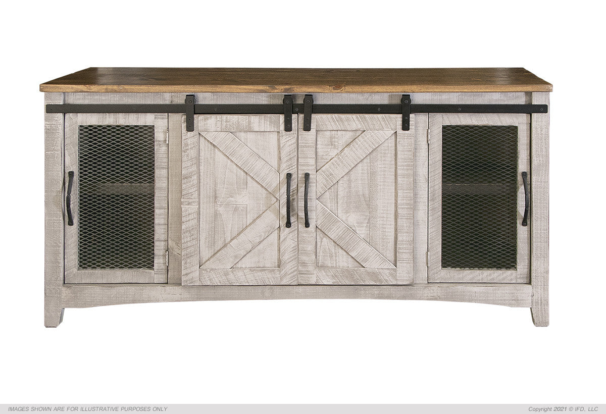 | Featured-2 | 100% solid pine, great durability and value. Multi-step lacquer water-base natural brown finish on tops, gray finish on base. Mortise and tenon construction ensures stability and durability on all pieces. Solid wood floated tops allow for wood’s natural movement. Non-chip, custom pulls are durable and unique. Barn doors with gliding mechanism addsauthentic rustic charm. TV Stand features wire management on backpanel. Piers are universal and may be used bythemselves. Fixed shelves on piers. TV stand is 67-3/4” wide, may be used by itself. Doors feature iron mesh on panels. | |