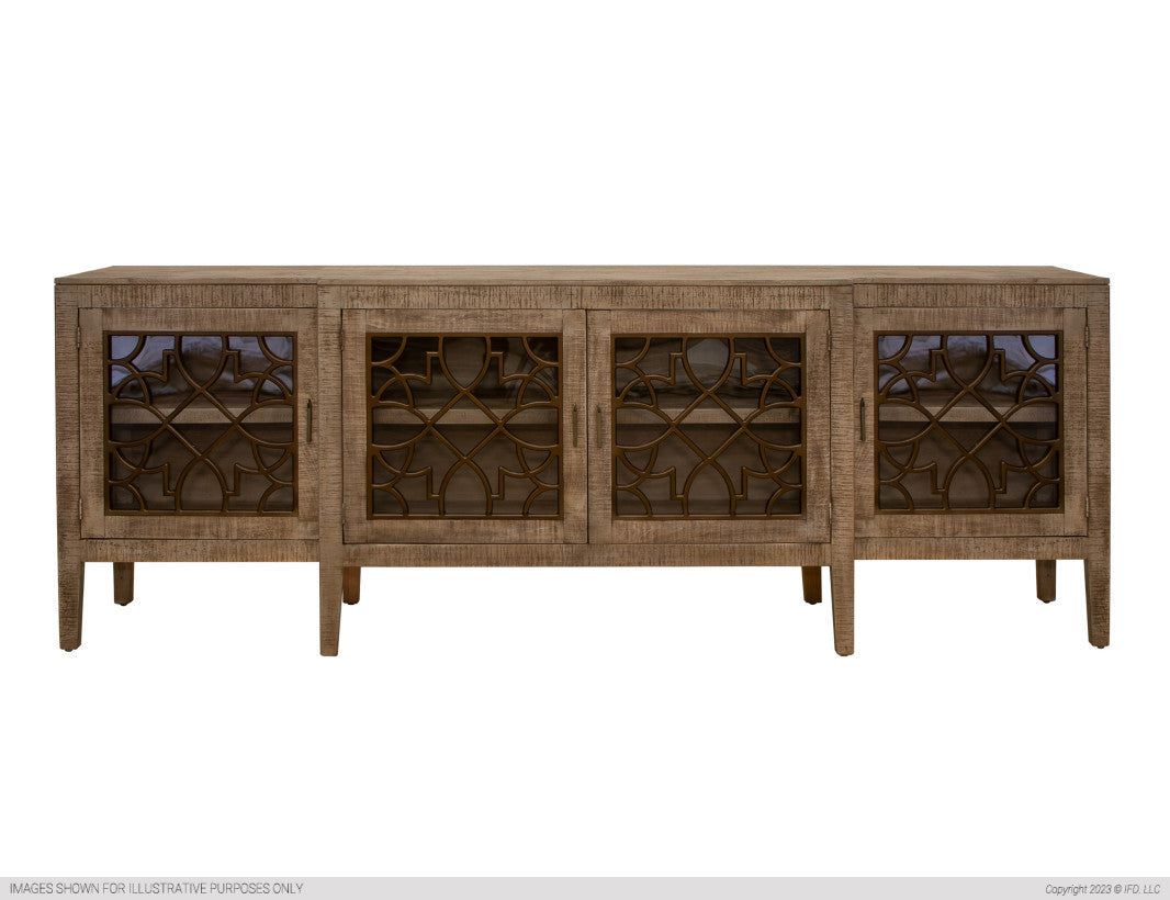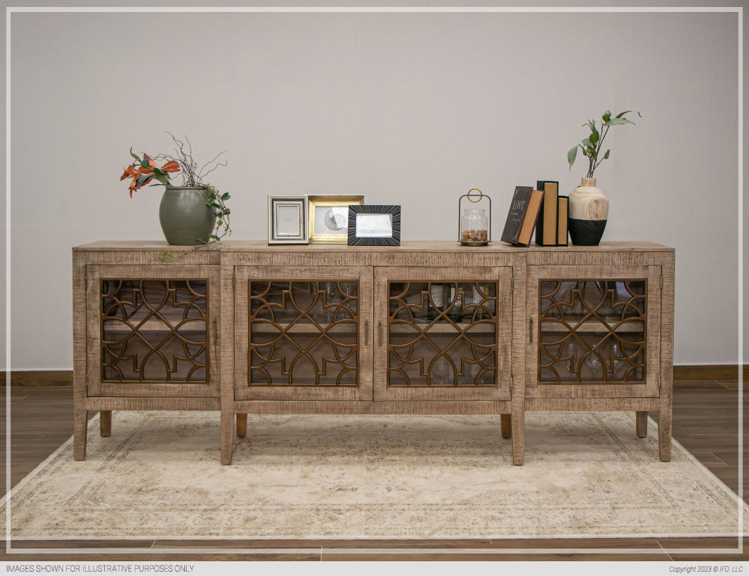 | Featured-2 | Our Signature "Gift from the Sea." The Mandala Console features exquisite designs on its glass door. Our products are made from high-quality pine and offered at an excellent value.Distressed Drift Sand finish is applied with a hand-rubbed technique in a multi-step process. Mortise and tenon construction ensure stability and durability. Engineered multi-ply boards.Four doors and fixed shelves behind doors. | |
