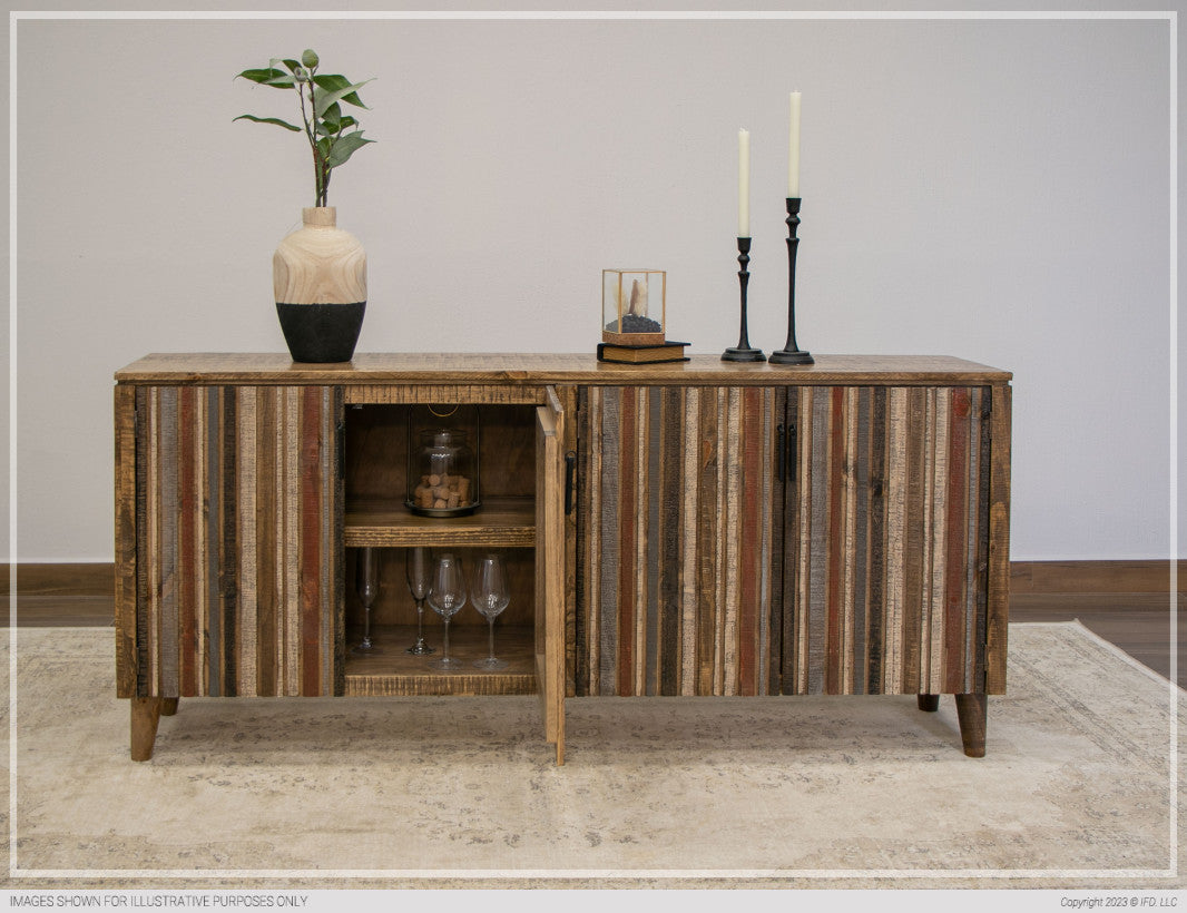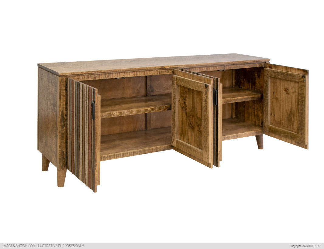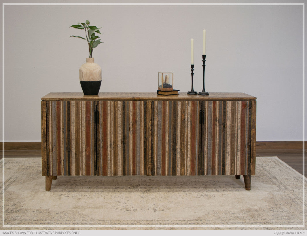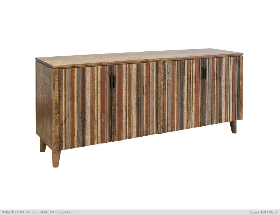 | Featured-2 | Tiza Console features a timeless, clean-lined design with a simple silhouette.Featuring only the finest grade pine for a great value.Multi-step lacquer in a soft multicolored hand-distressed finish with red highlights.Four doors open to reveal a room for dishes, glasses, or media items.Mortise and tenon construction ensures stability and durability. Engineered multi-ply lateral boards.Pedant pulls in a black finish.Tapered legs ship KD. | |