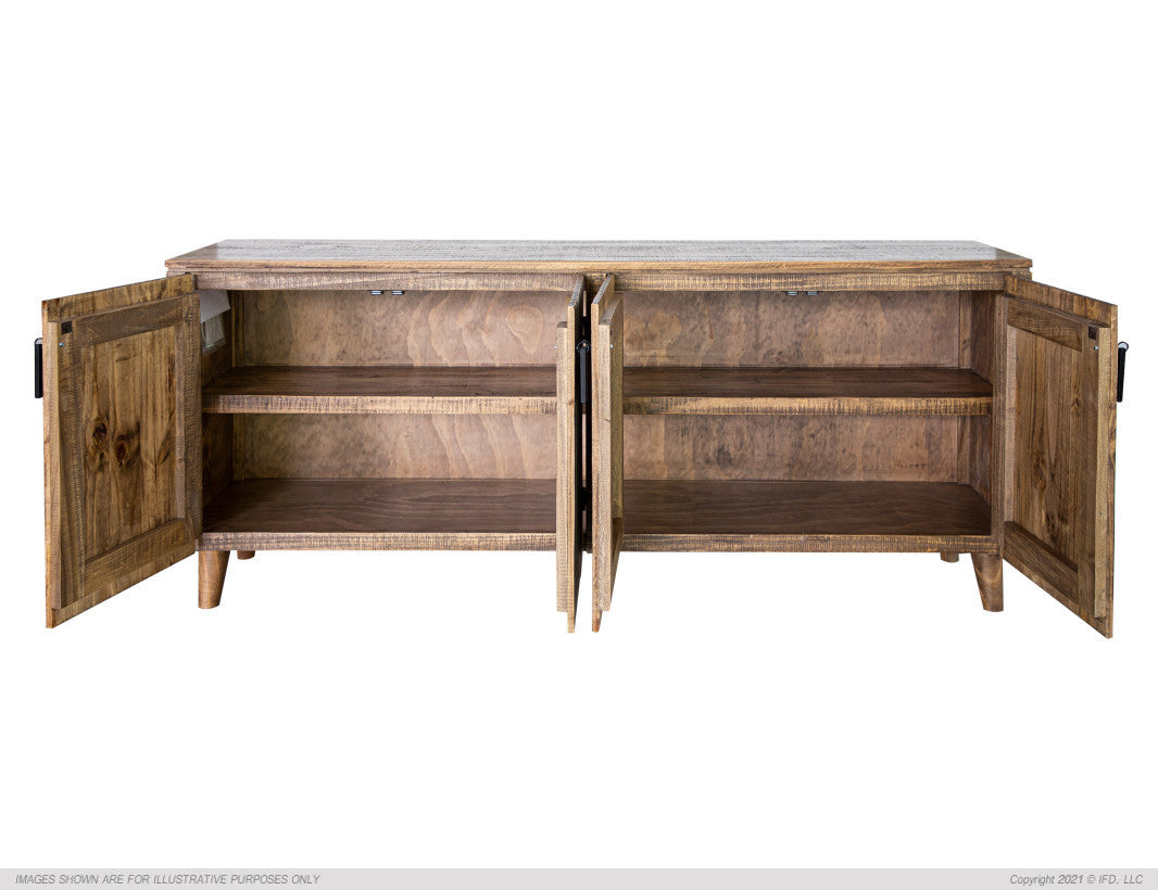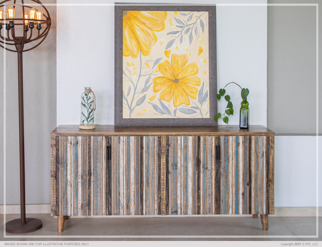 | Featured-2 | Tiza Console features a timeless, clean-lined design with a simple silhouette.Featuring only the finest grade pine for a great value.Multi-step lacquer in a soft multicolored hand-distressed finish with blue highlights.Four doors open to reveal a room for dishes, glasses, or media items.Mortise and tenon construction ensures stability and durability. Engineered multi-ply lateral boards.Pedant pulls in a black finish.Tapered legs ship KD. | |