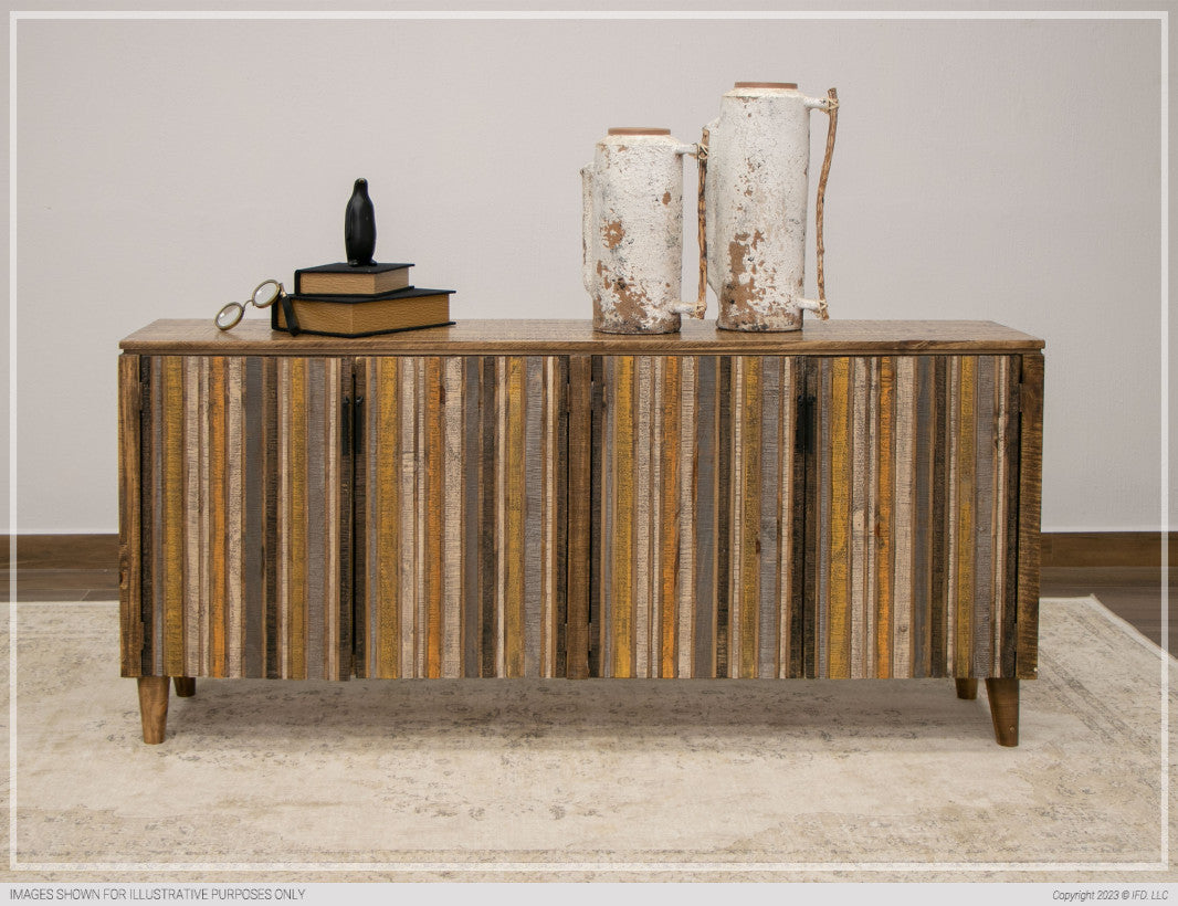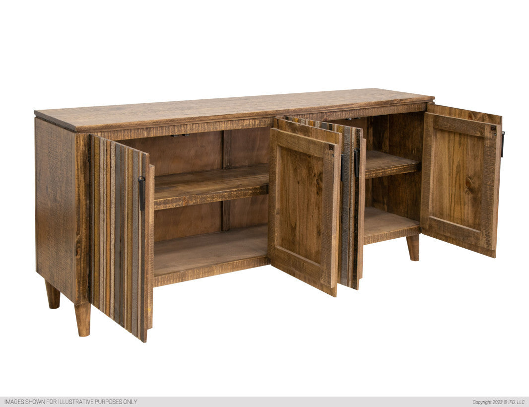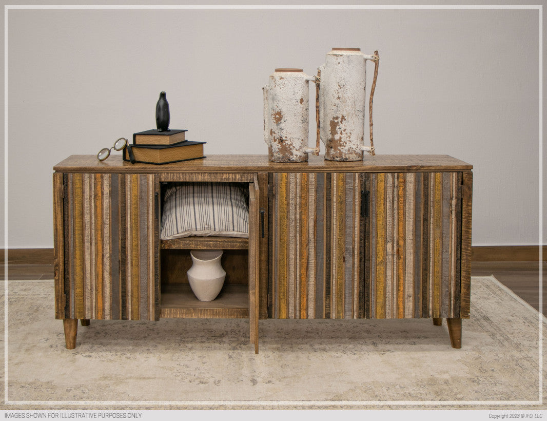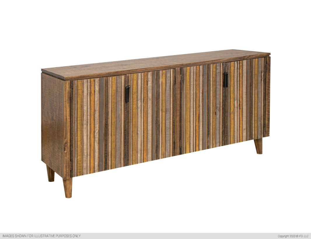 | Featured-2 | Tiza Console features a timeless, clean-lined design with a simple silhouette.Featuring only the finest grade pine for a great value.Multi-step lacquer in a soft multicolored hand-distressed finish with yellow highlights.Four doors open to reveal a room for dishes, glasses, or media items.Mortise and tenon construction ensures stability and durability. Engineered multi-ply lateral boards.Pedant pulls in a black finish.Tapered legs ship KD. | |