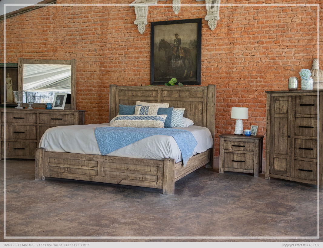 | Featured-2 | Featuring solid pine for a great value. Exclusive solid engineered tops add stability to solid wood. Multi-step lacquer finish with hand-rubbed highlights for a light brown finish. Knots on the solid wood surface are a natural marking that make each piece of lumber unique, wormholes effect add character without affecting the integrity of the wood. Mortise and tenon construction ensures stability and durability on all pieces. English dovetailing on 100% solid wood drawer fronts. Extension metal glides. Microfiber-lined top drawers on dresser and nightstand. Cast Iron Pulls. Available in Queen, Eastern King and California King Sizes. Box spring is required. | |