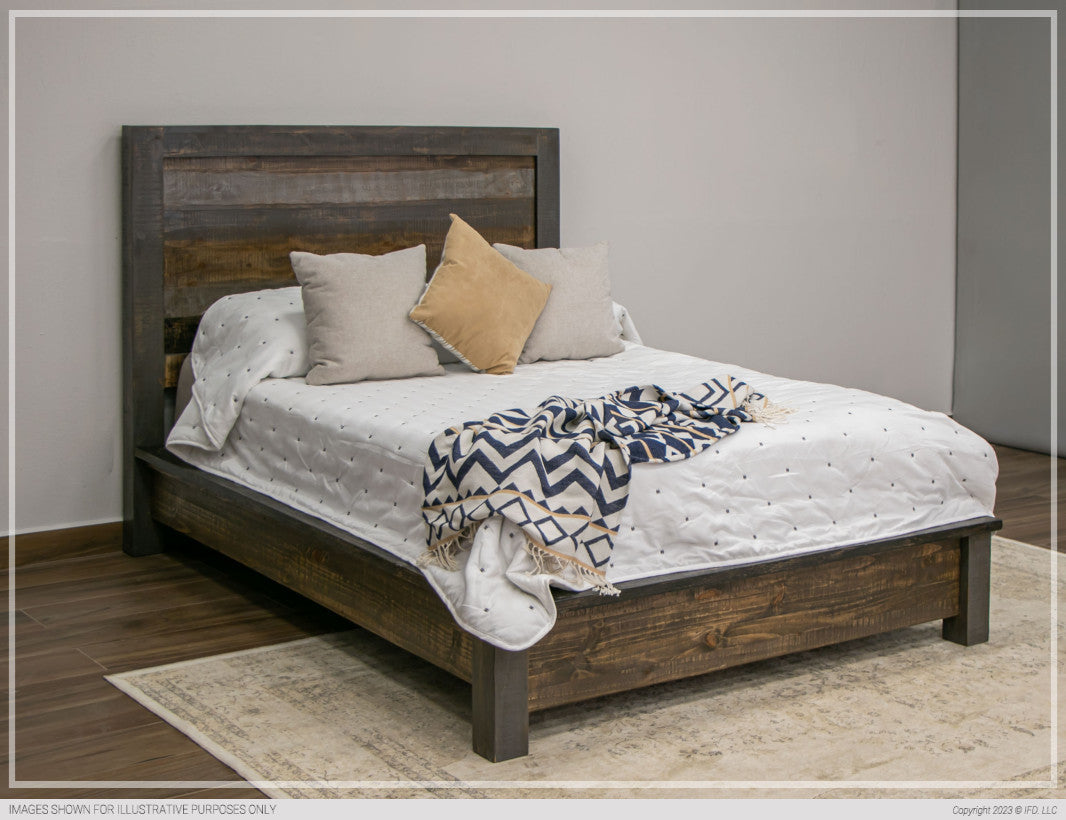 | Featured-2 | The New Full-size configuration features 100% solid pine, great durability, and value.Six-step, hand-painted finish in a gray and brown color scheme for a “reclaimed wood” look. Water-based acrylic lacquer coating provided protection to wood and finish durability.Mortise and tenon construction ensure stability and durability in every piece.Transitional bases on case goods constructed in 100% solid pine offers a mixed media look at a value.Microfiber-lined drawers on Dresser and Nightstand’s top row.English dovetail drawer fronts and ball-bearing extension metal glides offer superior stability and a smooth glide to drawers.Hand-forged iron pulls.Box spring is not required; this is a true platform bed. | |