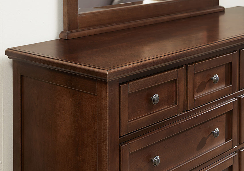 Made in the USA, this triple dresser with eight drawers offers casual style to any bedroom in your home. Its design elements with framed drawer fronts, tapered feet, and simple molding create a look that fits within contemporary to transitional space. The base rail is gently curved to add dimension to complete this dresser.