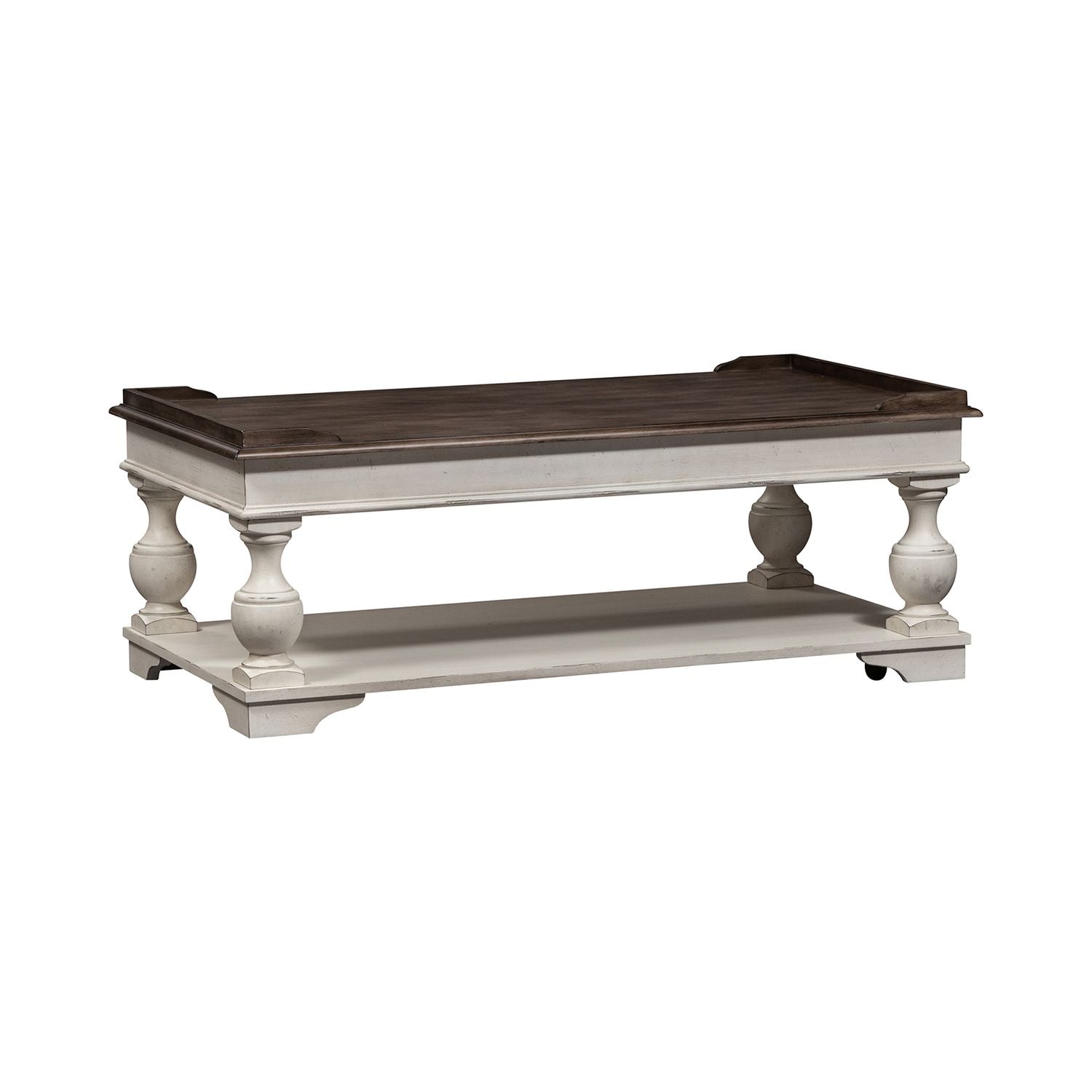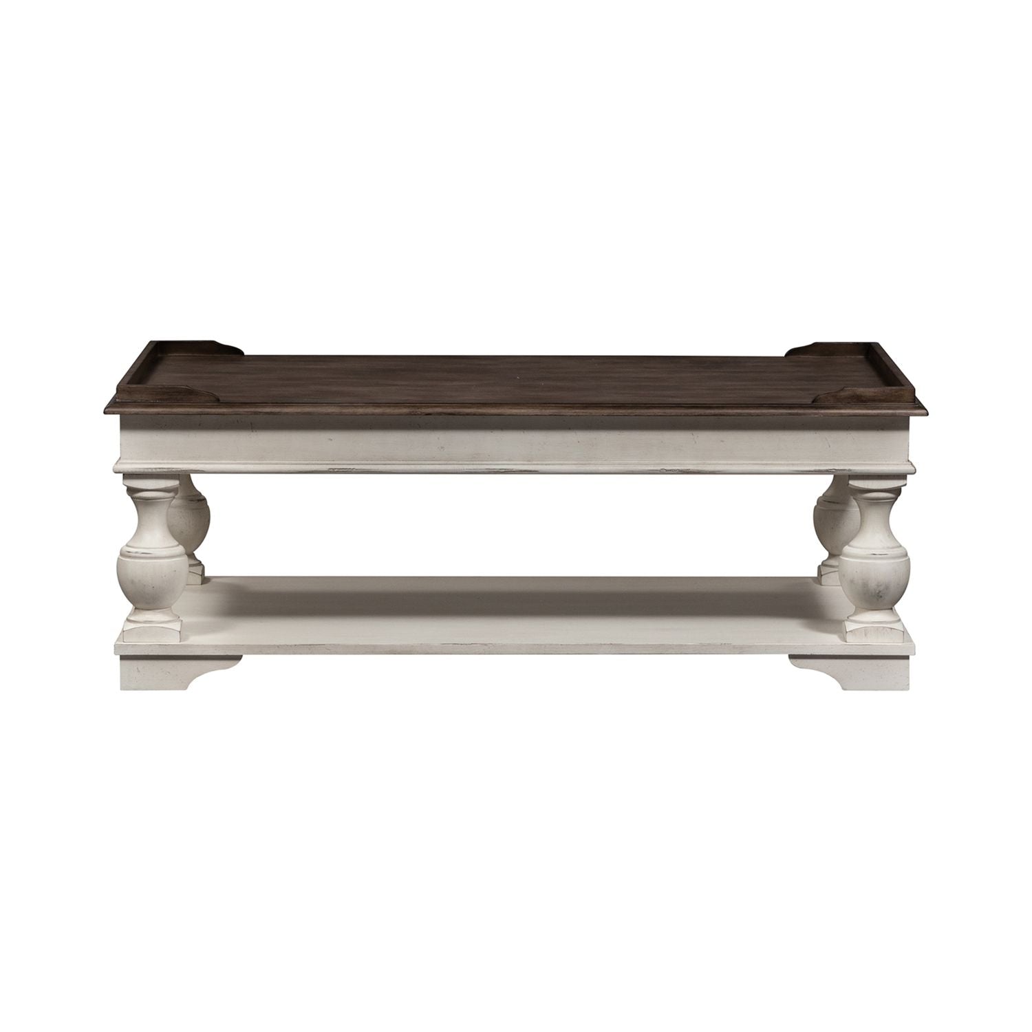 Enhance your traditional style space with the Abbey Road lift top cocktail table. Crafted of poplar solids and birch veneers, this piece features a porcelain white finish with a Churchill brown top, casters for easy moveability, stylish tray top styling, a lift top that can extend up to 29.25”, a bottom shelf for additional storage, and is anchored by heavy round turned legs. This luxurious lift top cocktail table would make a wonderful addition to your home.