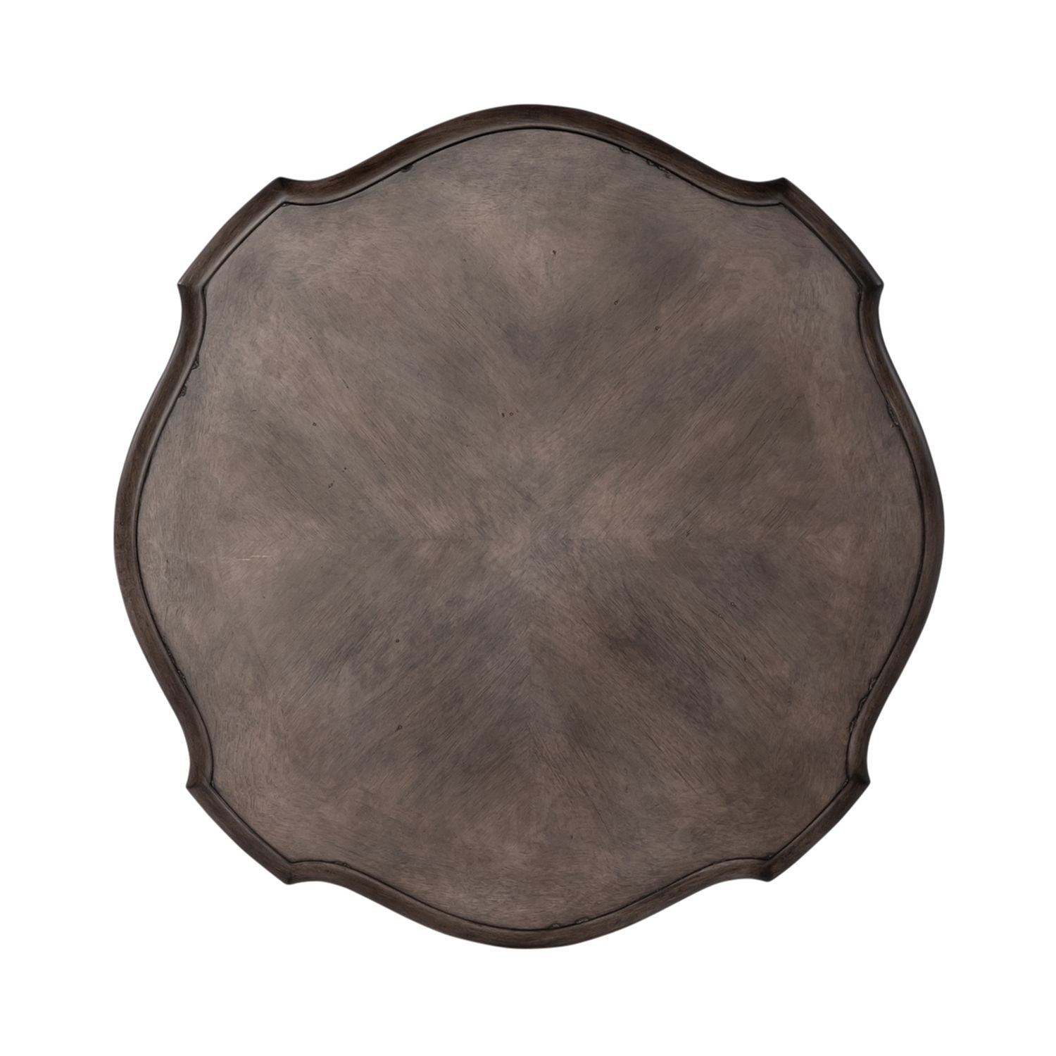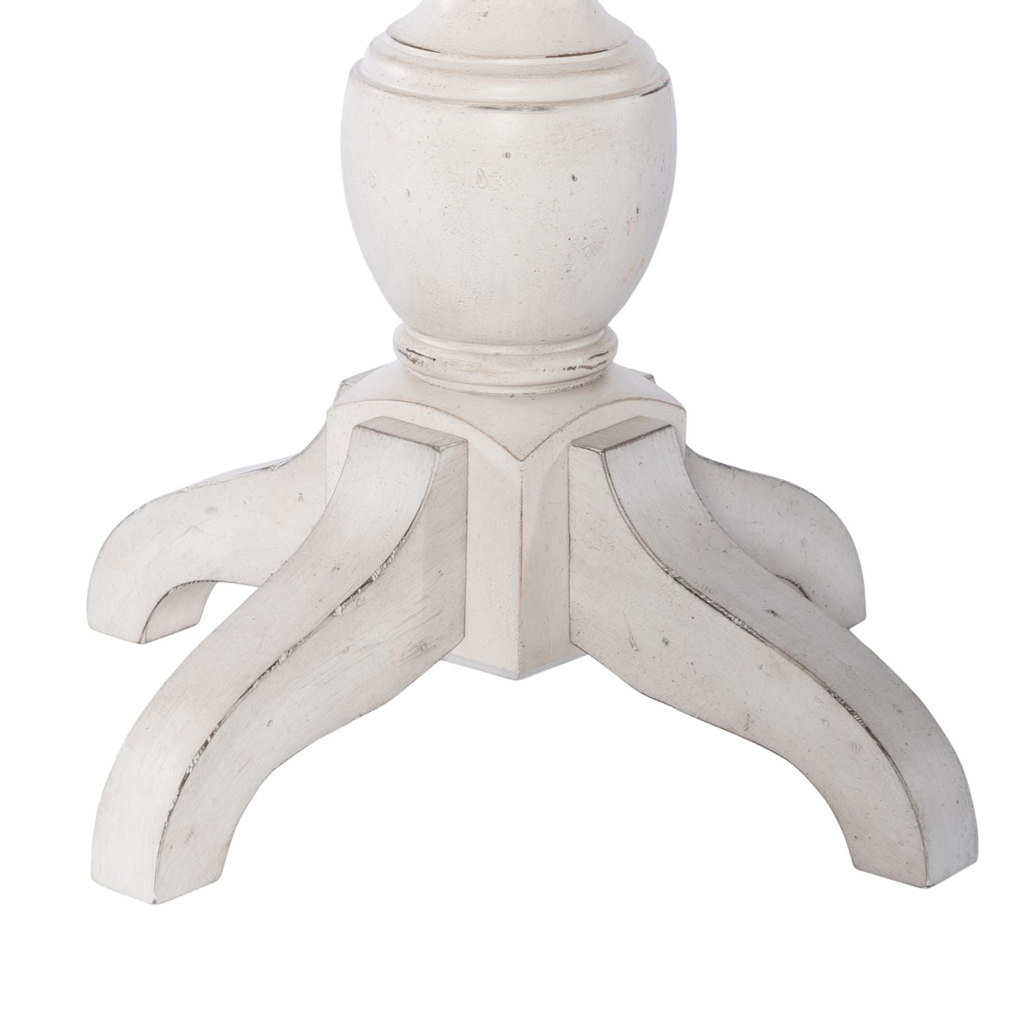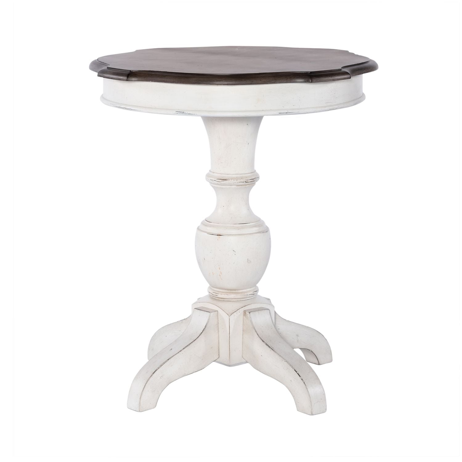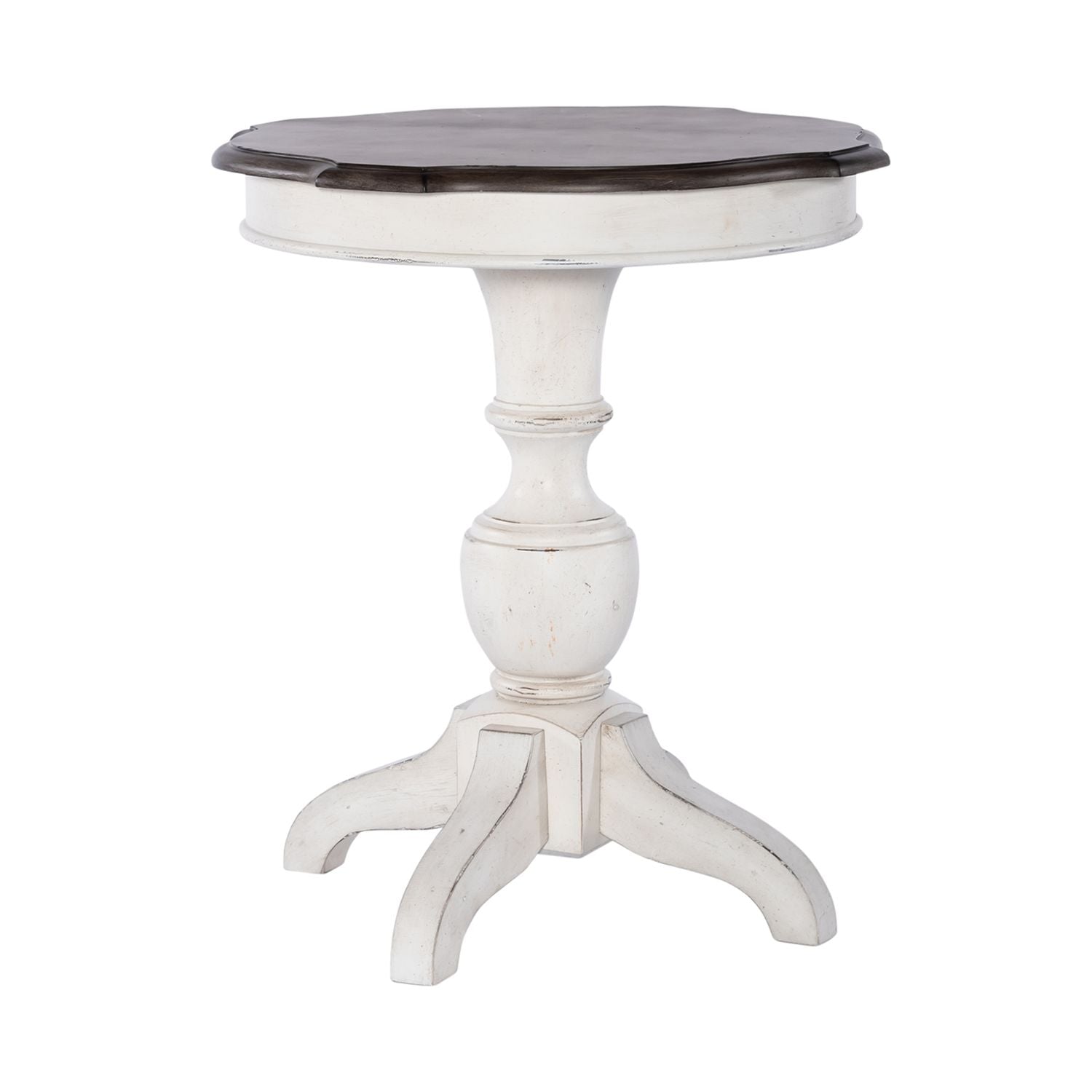 Accent your space with the Abbey Road round end table. Crafted of poplar solids with birch veneers, this piece features a porcelain white finish with a Churchill brown top, appealing scalloped shaped top, anchored by a round turned pedestal base with splayed legs. This unique end table will bring a warm feel to any luxurious antique style space.