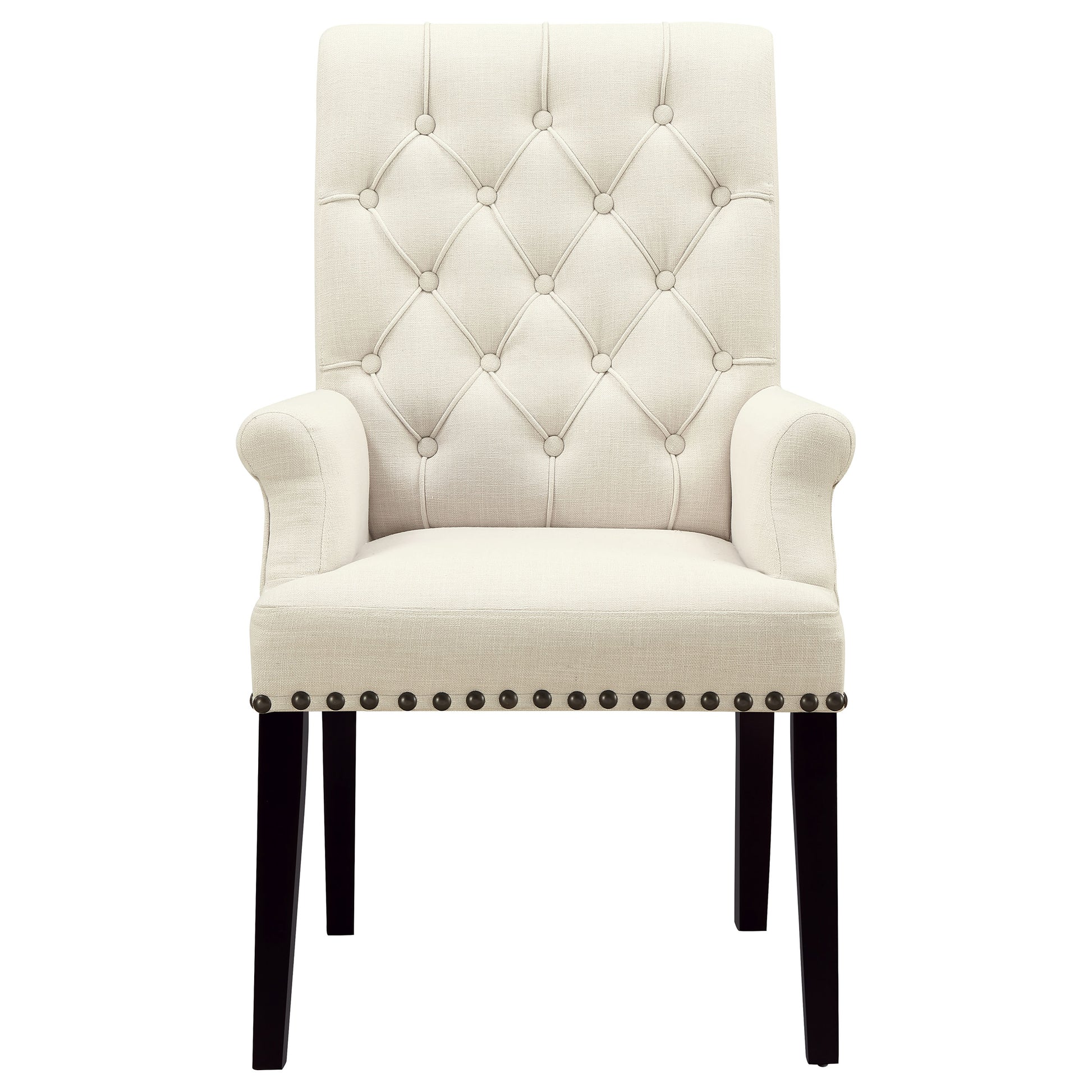 • Arm chair with a button-tufted back and elegantly rolled top