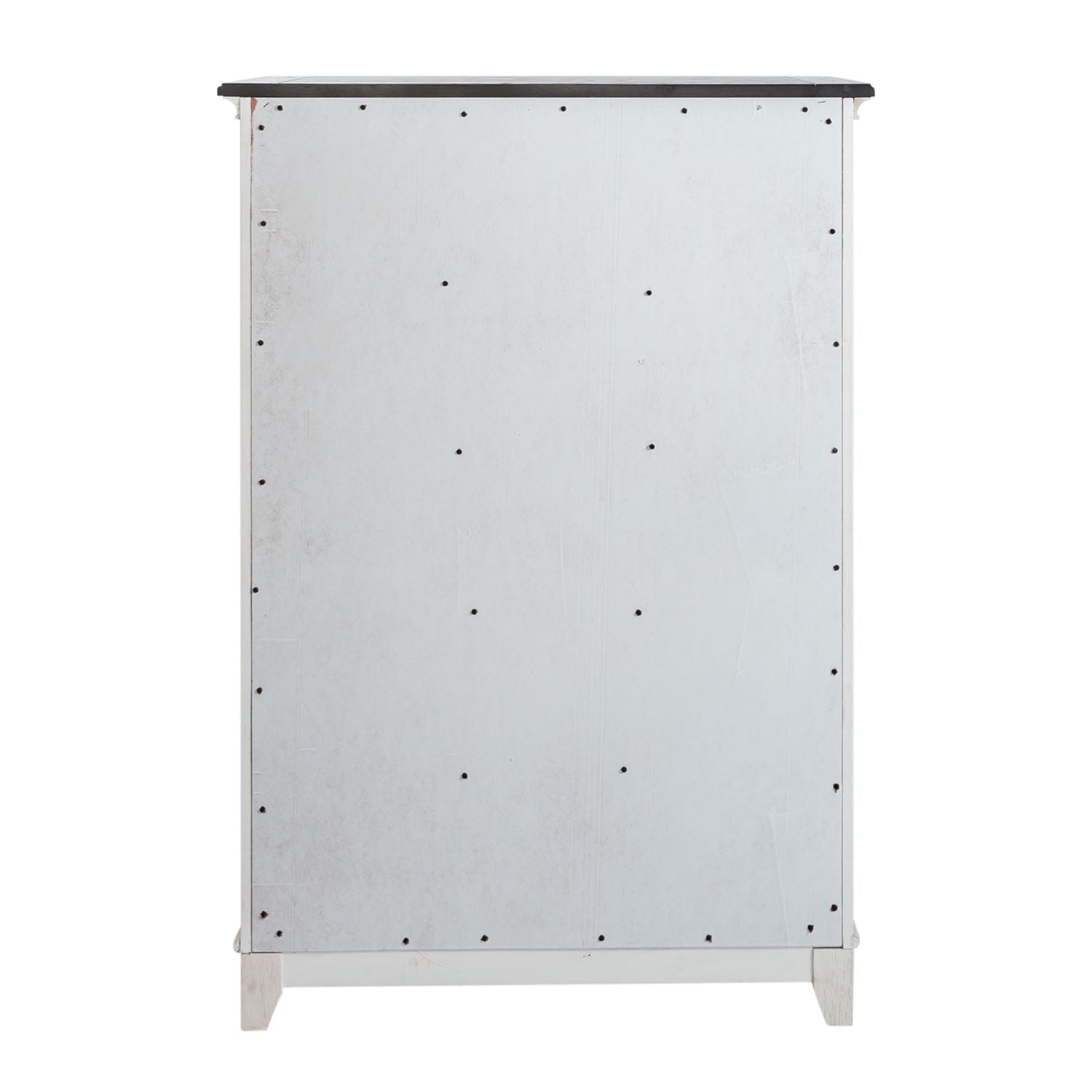 Create a classic cottage style with this 5 drawer chest. The two-toned wire brushed white finish with charcoal top adds a taste of vintage, allowing this piece to work from the mountains to an industrial loft. The charcoal top is accented by planks while the white base is highlighted by bead molding and antique pewter hardware. Crafted of poplar and rubberwood solids with cathedral white oak tops, his piece features fully stained interior drawers, full extension drawer glides for easy access to storage, felt lined top drawer, and is anchored by tapered feet. Style uncompromised with storage abound, enjoy the ample drawer storage, each equipped with bottom case dust proofing.