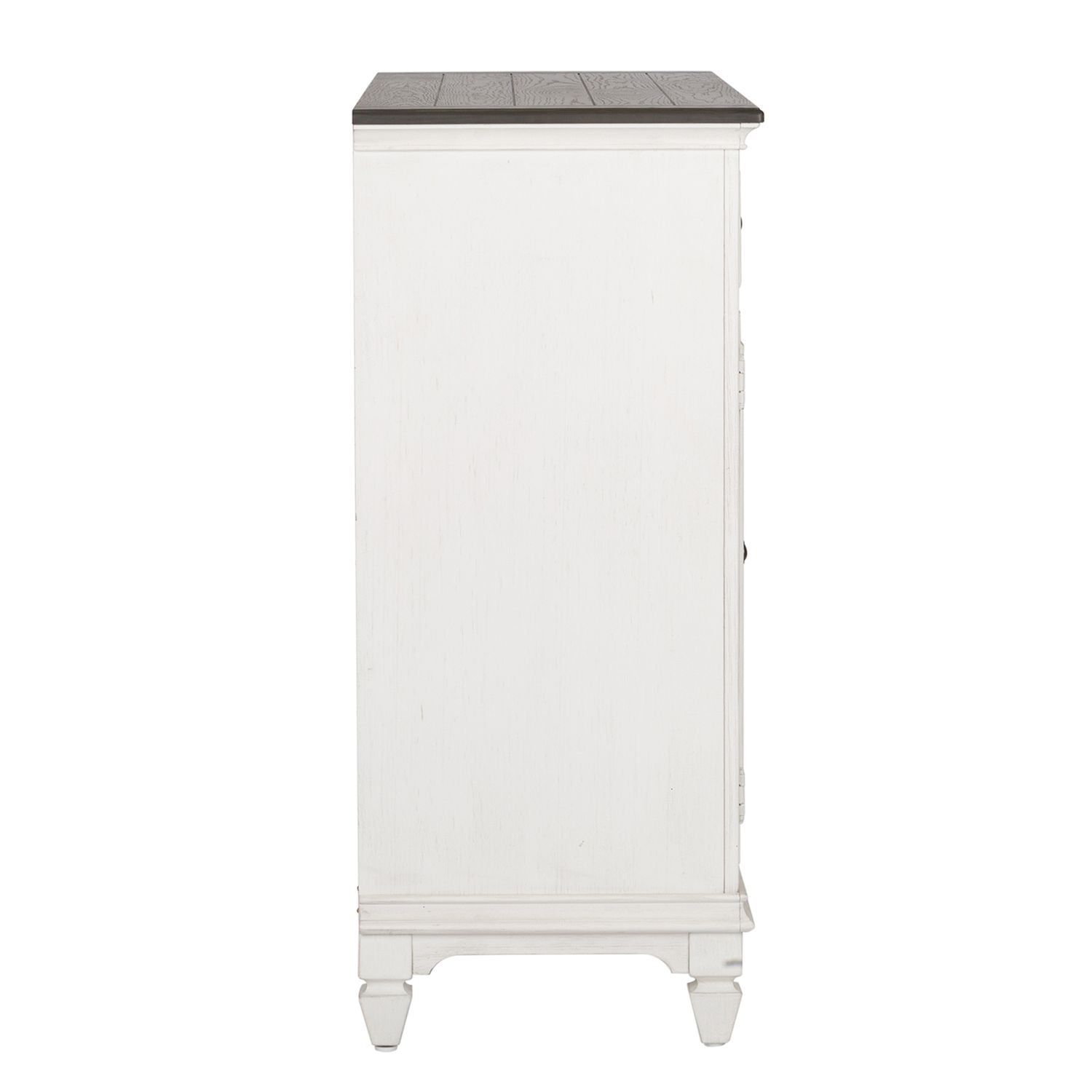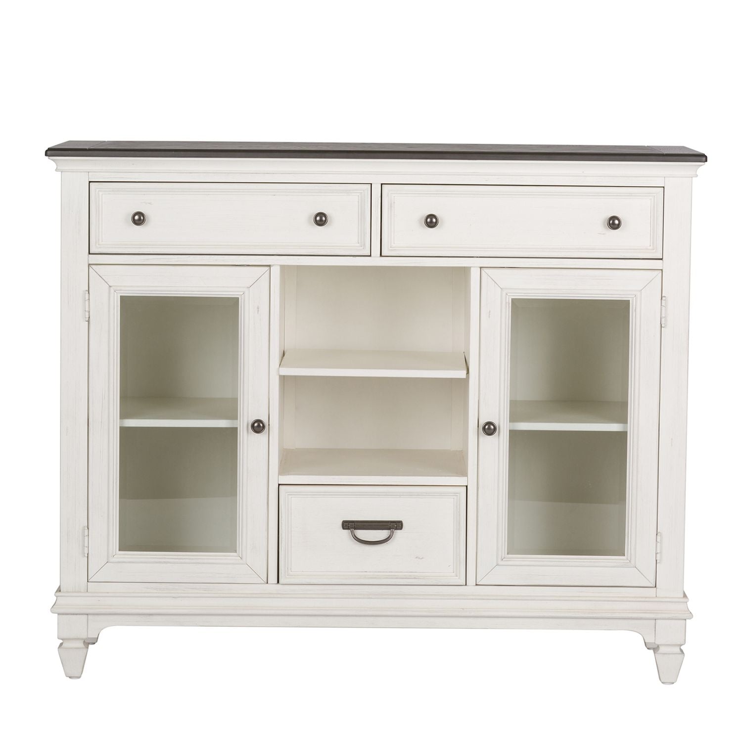 Reinvent your style with a memorable piece. The Allyson Park buffet is crafted of poplar and rubberwood solids with cathedral white oak tops and features a wire brushed charcoal planked top with a wire brushed white base that has brown undertones, all accented with antique pewter knob and drop bail hardware. This buffet has an open center shelf with wine storage flanked between two wood framed glass doors. Behind each door is one adjustable shelf. Three wood framed full extension drawers round out this piece, with the top two drawers being lined with felt. The Allyson Park buffet offers cottage styles you love that will work from the beach to the mountains to an industrial loft.
