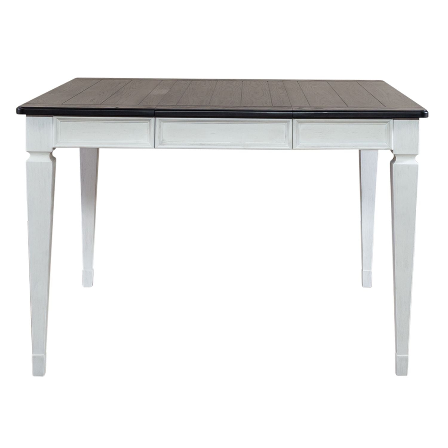 Gather the entire family around the Allyson Park counter height leg table. Crafted of poplar and rubberwood solids with pine veneers and cathedral white oak veneer top), this piece features a wire brushed white finish with charcoal tops, planked top, one 18" leaf to accommodate guests or a larger family with ease and is anchored by square turned legs. This table is perfect for creating a classic look, while maintaining a casual feel.