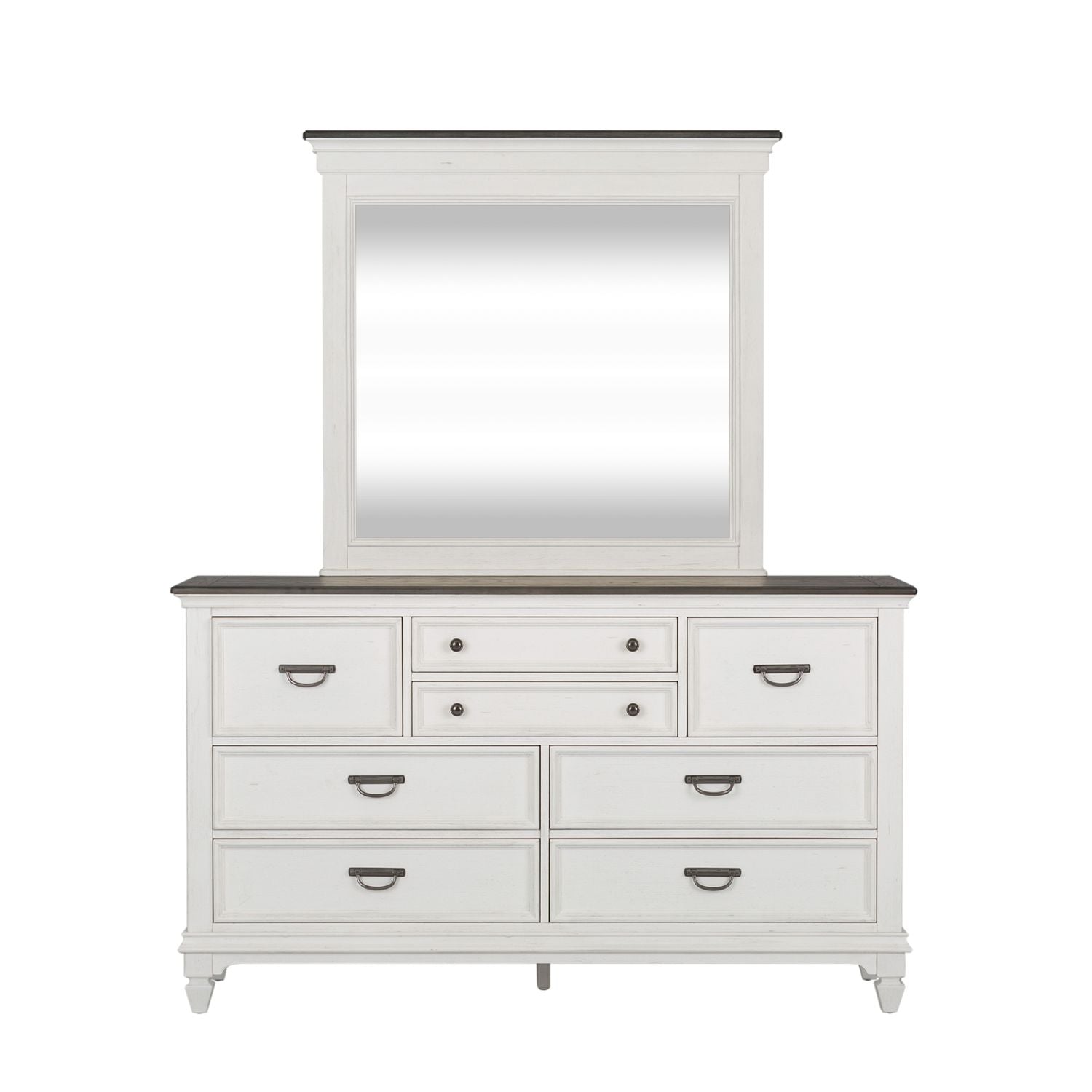 Bring beauty indoors with the Allyson Park dresser and mirror. Crafted of pine solids and veneers with cathedral white oak tops, this kit features a wire brushed white finish with planked charcoal tops, bead molding, full extension drawers with felt lined top drawers, and is accented with antique pewter knob and drop bail hardware. The dresser has eight drawers of varying sizes and pairs well with the crown mirror with its bead molding and beveled edge. Allyson Park offers cottage styles you love in a wire brushed two tone finish that will work from the beach to the mountains to an industrial loft.