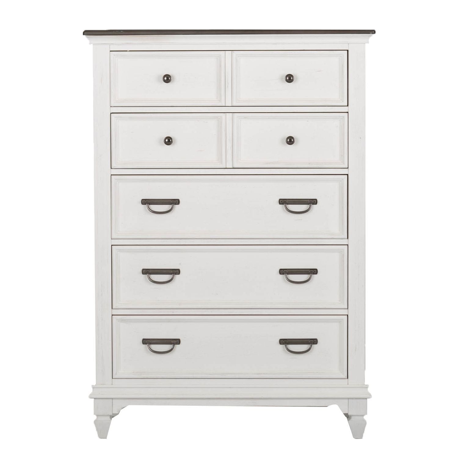 Bring beauty indoors with the Allyson Park king panel bed, dresser, mirror, chest, and nightstand. Crafted of pine solids and veneers with cathedral white oak tops, this kit features a wire brushed white finish with planked charcoal tops, bead molding, full extension drawers with felt lined top drawers, and is accented with antique pewter knob and drop bail hardware. The panel bed features a planked headboard and footboard in a two-tone finish. The dresser has eight drawers of varying sizes and pairs well with the crown mirror with its bead molding and beveled edge. The chest offers an additional five drawers of storage, with the top two drawers having bluff-cut drawer fronts to give the illusion of multiple smaller drawers, while still offering deep storage. Place the three drawer nightstand next to your bed and utilize the convenience of the built-in charging station, complete with two electrical outlets and two USB ports. Allyson Park offers cottage styles you love in a wire brushed two tone finish that will work from the beach to the mountains to an industrial loft.