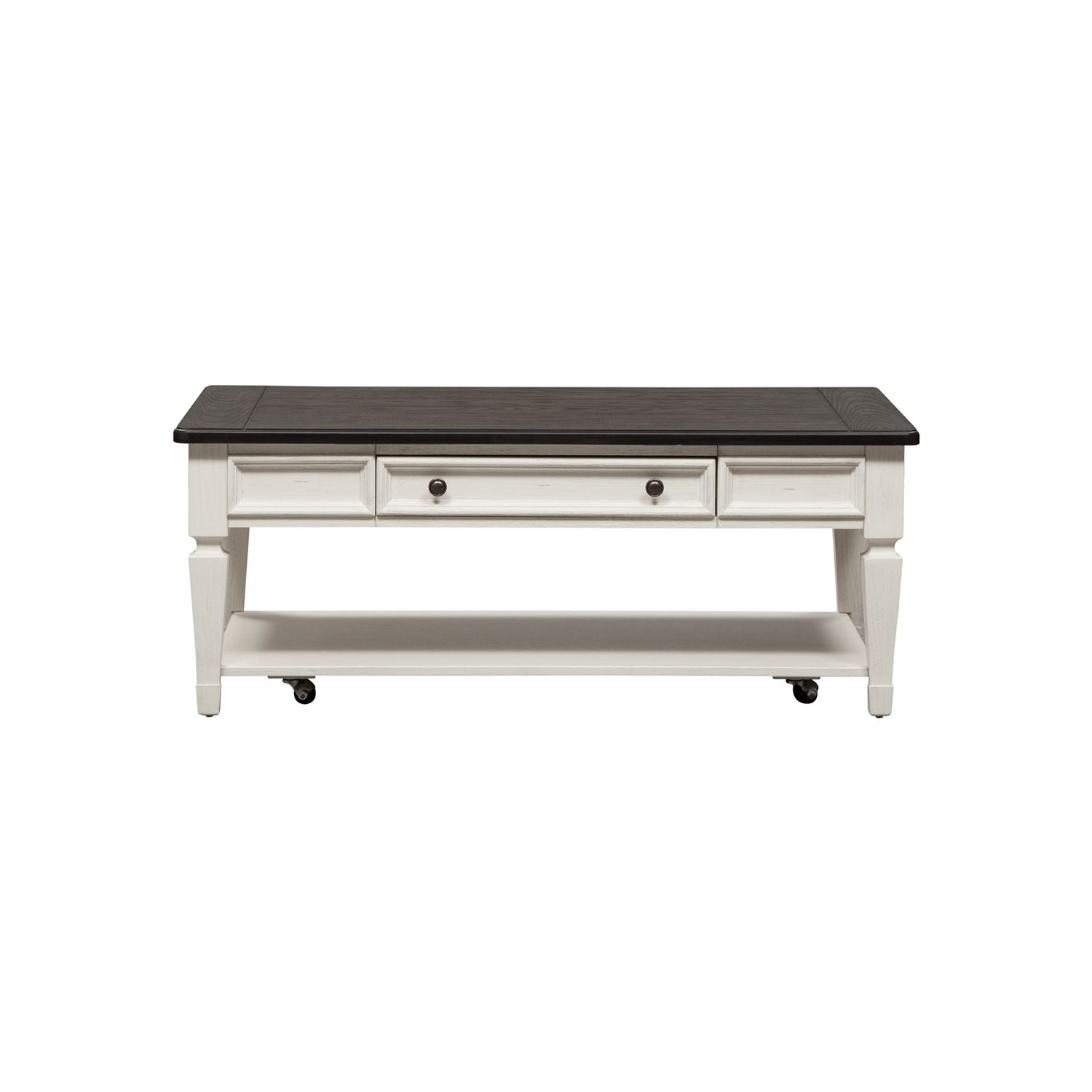 Accent your living space with the Allyson Park rectangular cocktail table. Crafted of pine, rubberwood, and poplar solids with cathedral white oak tops and pine veneers, this piece features a wire brushed white finish with a charcoal top, full extension drawer glides for easy access to storage, planked top, bead molding accents, one drawer, a bottom shelf for additional storage, casters that make rearranging a breeze, square turned tapered legs, and is accented by antique pewter knob hardware. This table is perfect for creating a classic look while maintaining a casual feel.