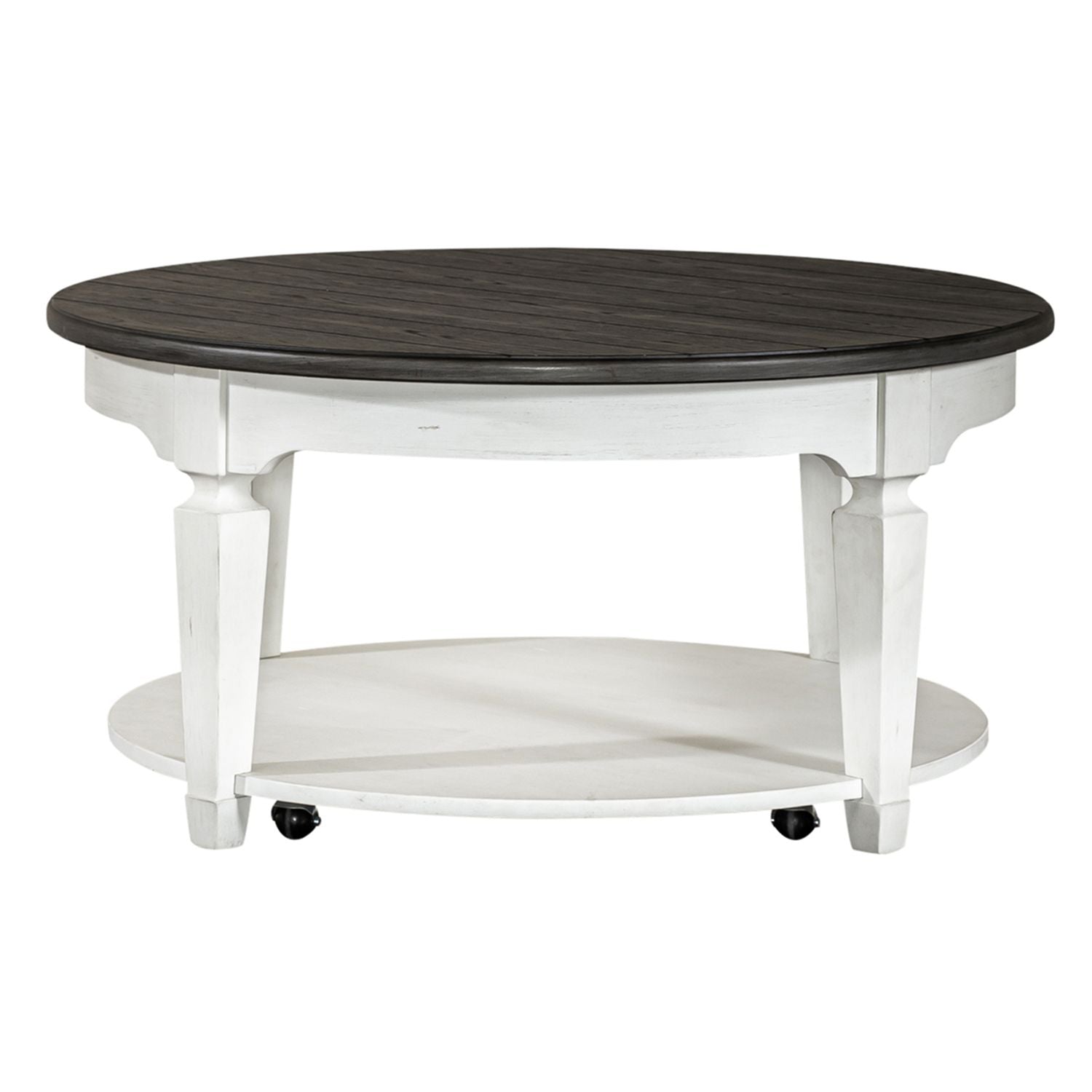 Enjoy family game night around the Allyson Park round cocktail table. Crafted of pine solids and veneers with cathedral white oak tops, this piece features a wire brushed white finish with a planked charcoal top, a bottom shelf for additional storage, casters for easy moveability, and anchored by square tapered legs. This classic cocktail table would make a gorgeous addition to your casual styled home.