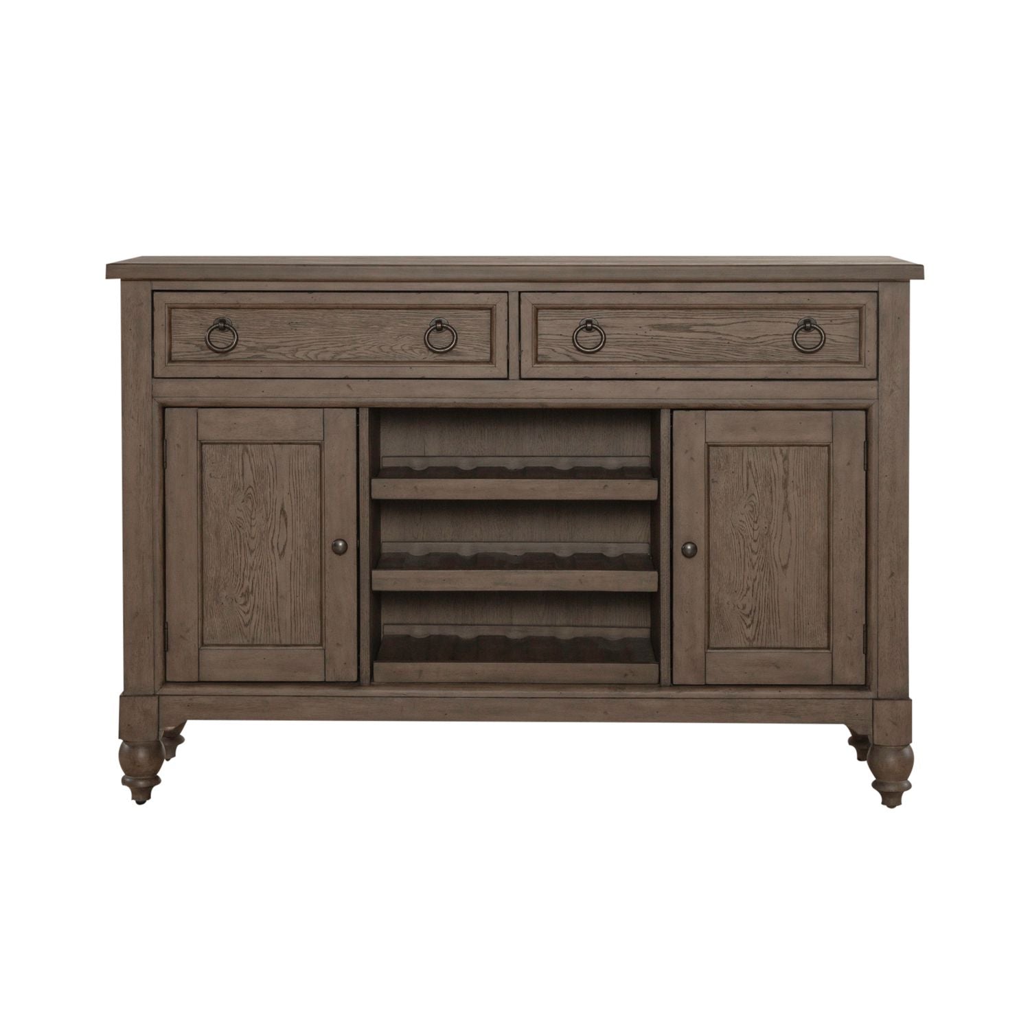 Turn your house into a home with the Americana Farmhouse buffet. Crafted with excellence using rubberwood solids and split heart white oak veneers, this piece features a Dusty Taupe finish. The buffet has two full extension drawers that are felt lined, with wood framed drawer fronts that are accented with Antique Brass drop ring hardware. There are two wood framed doors accented by Antique Brass knob hardware that open to reveal an adjustable shelf behind each. At the center of the buffet there are two removable shelves and one fixed shelf. These shelves are unique in that they are reversable; meaning you can use them as wine bottle storage or flip the shelves over for a traditional flat surface shelf for display items. With the turned bun feet, the Americana Farmhouse buffet offers a relaxed style with a classic look and a casual feel.