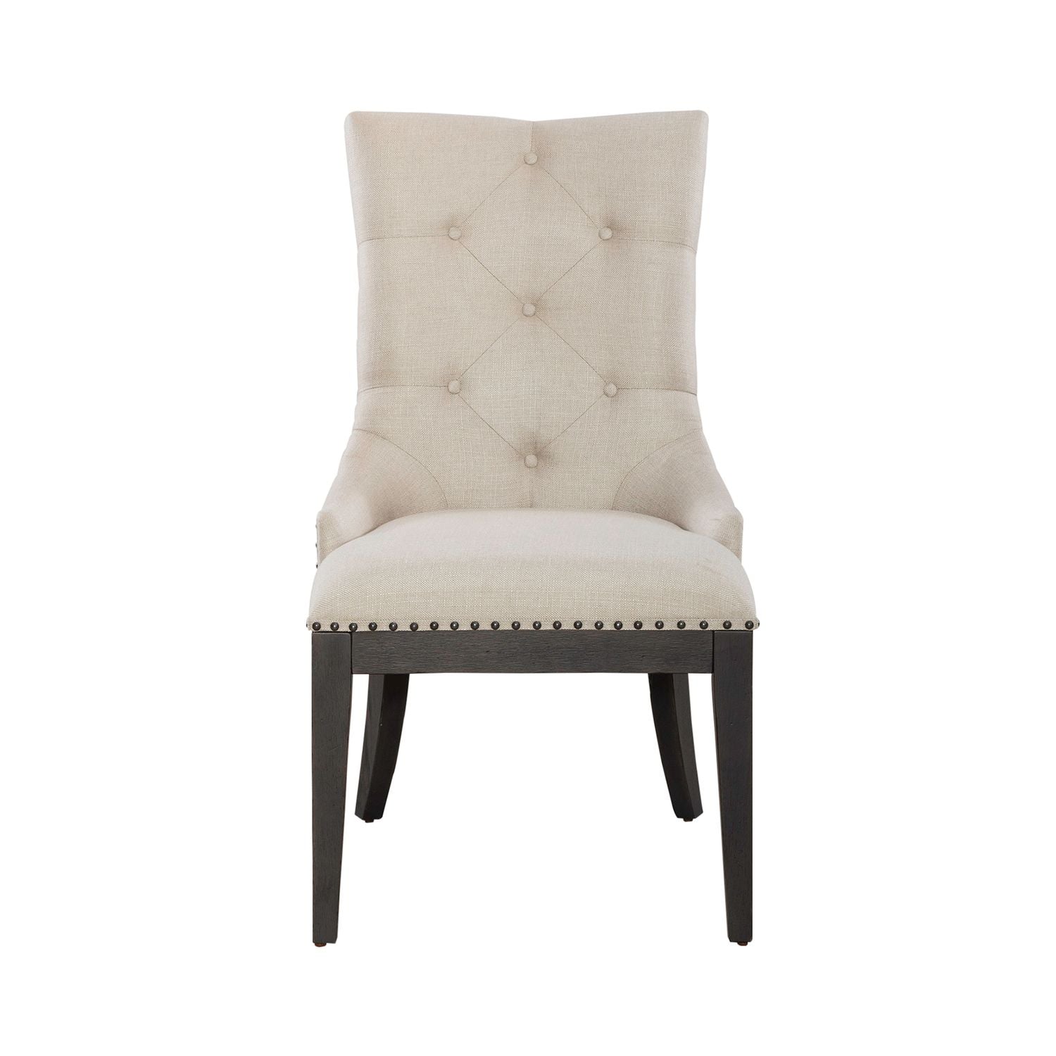 Reinvent your style and comfort with the Americana shelter side chair, prefect for any room in the house. Features exposed frame to giving you that deconstructed element, tufted back in a truffle linen fabric, nail head accents, web seating and tapered legs.