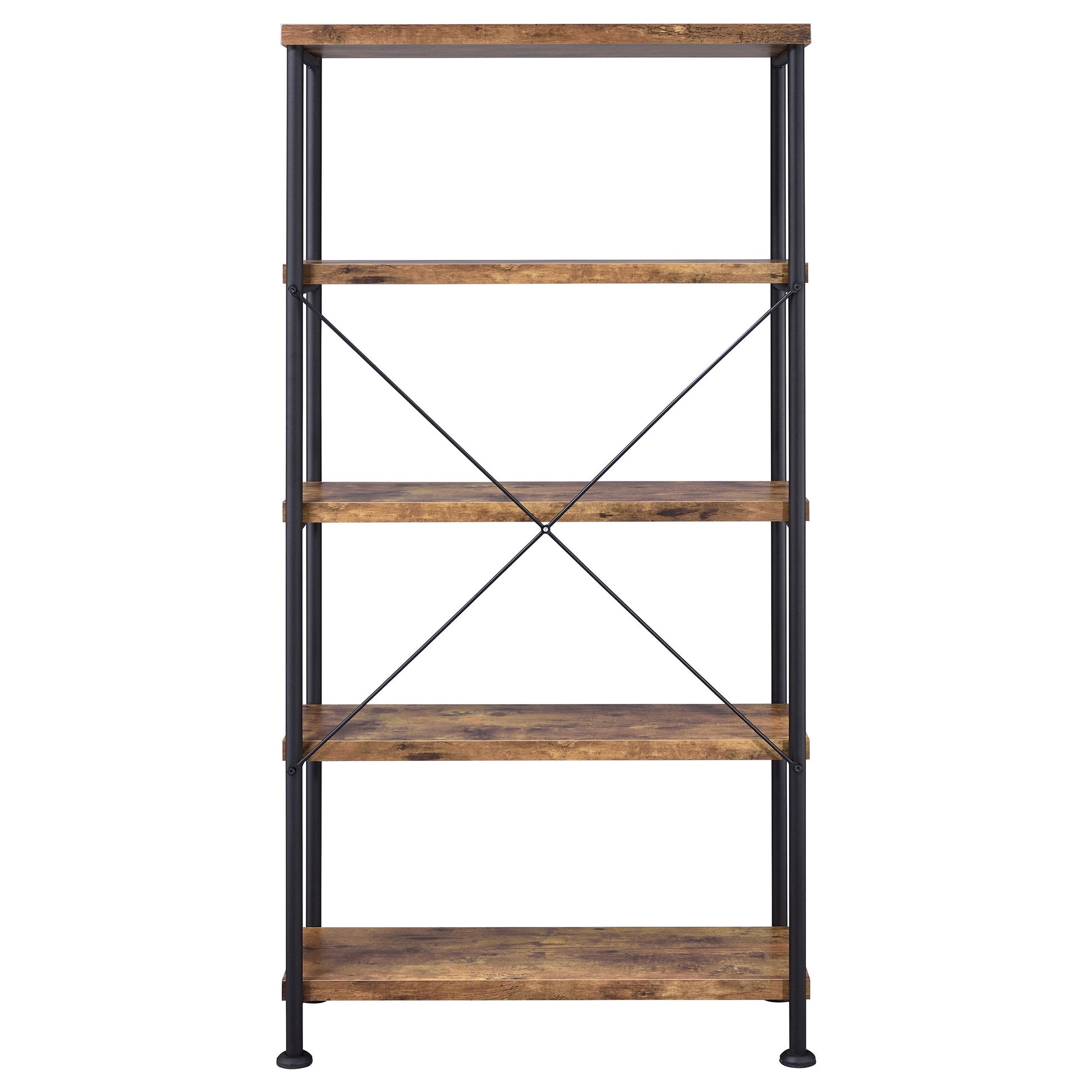 • Four-shelf bookcase with rustic nutmeg finish and open industrial styling