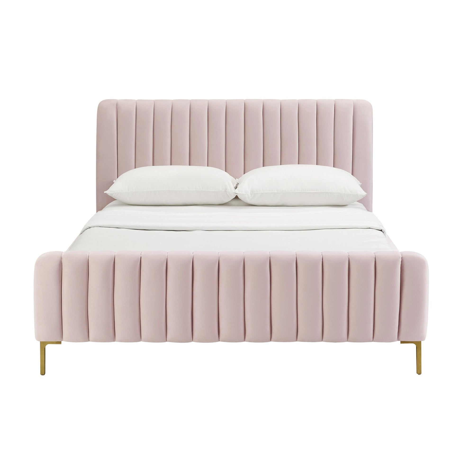 We can't guarantee your dreams will come true, but at least we can help you dream in style. The Angela bed features glam design, channel tufting and gold legs that pop against the sumptuous velvet upholstery. Available in queen or king and multiple color options.