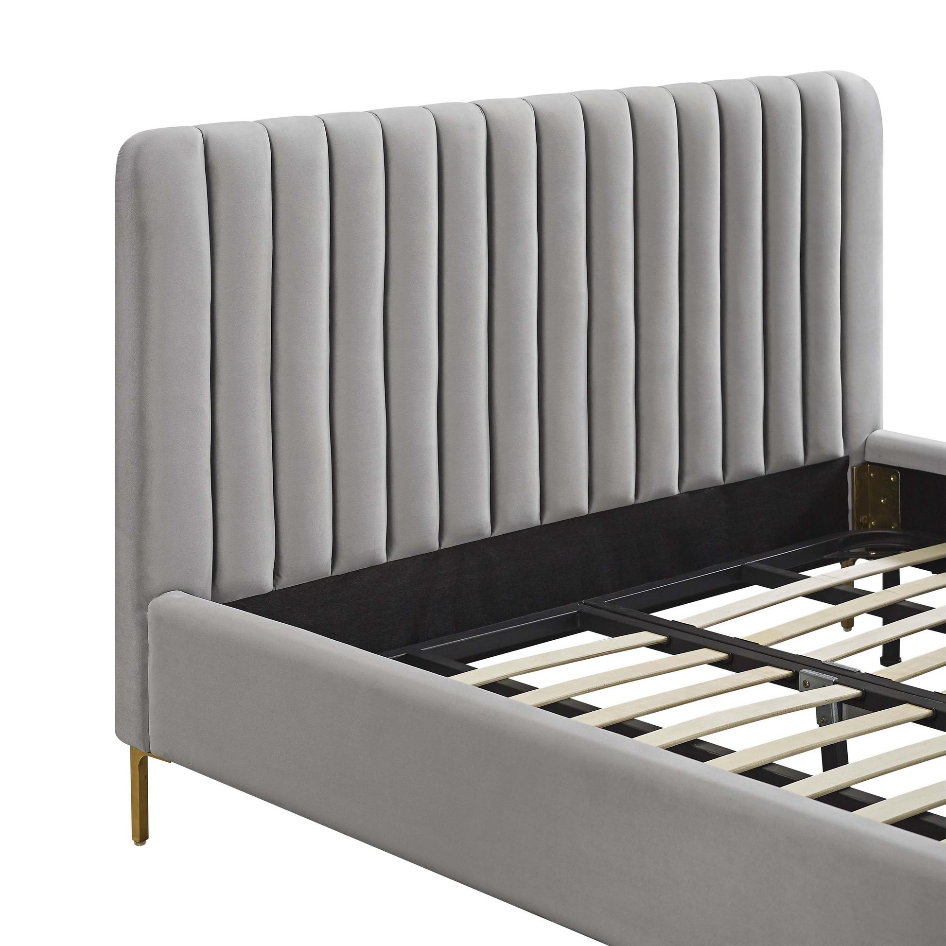 We can't guarantee your dreams will come true, but at least we can help you dream in style. The Angela bed features glam design, channel tufting and gold legs that pop against the sumptuous velvet upholstery. Available in full, queen, or king and multiple color options.