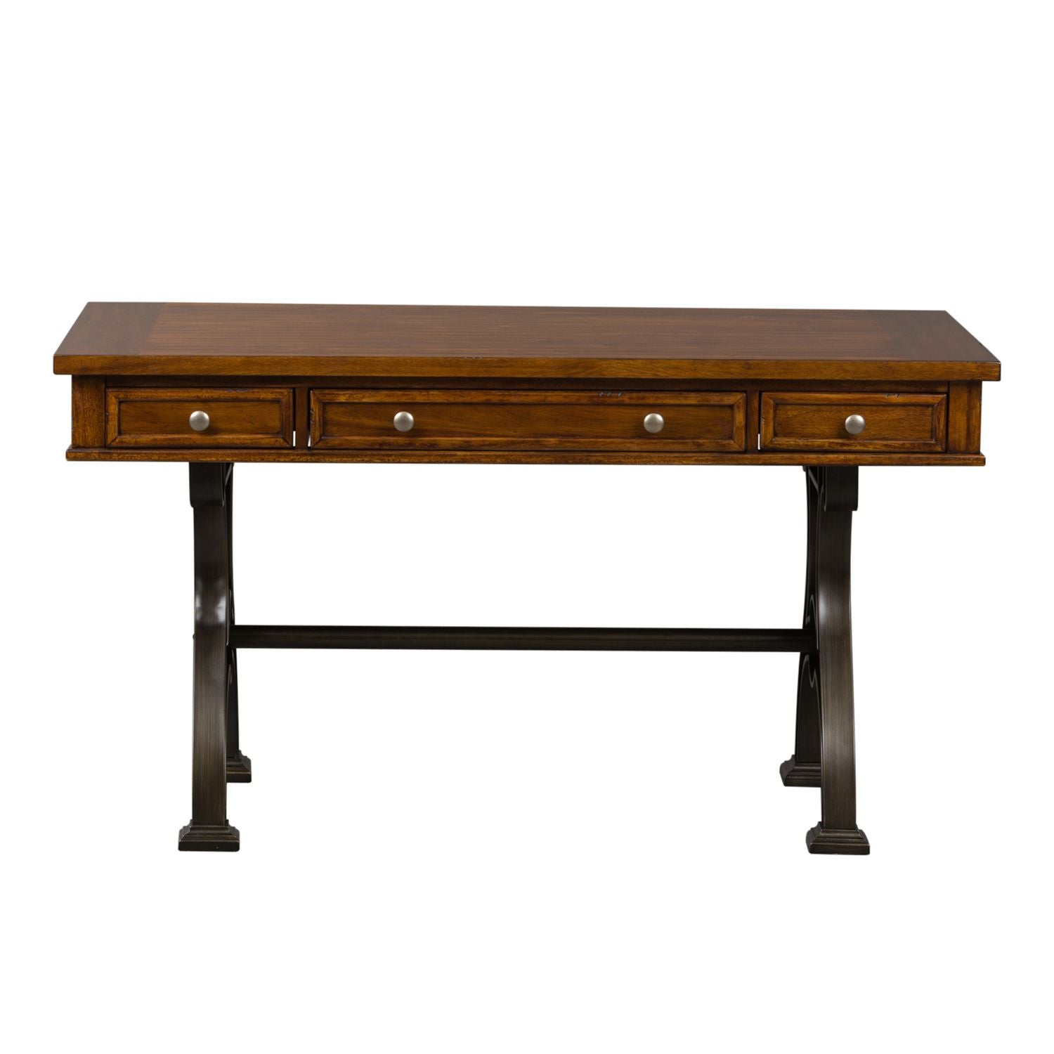 Work from home or the office in timeless style with the Arlington House writing desk. Crafted of poplar solids with acacia veneers and metal tube framing, this piece features a cobblestone brown finish and antique pewter knob hardware. The writing desk features three full extension drawers including a flip down keyboard tray, and a metal industrial style base.