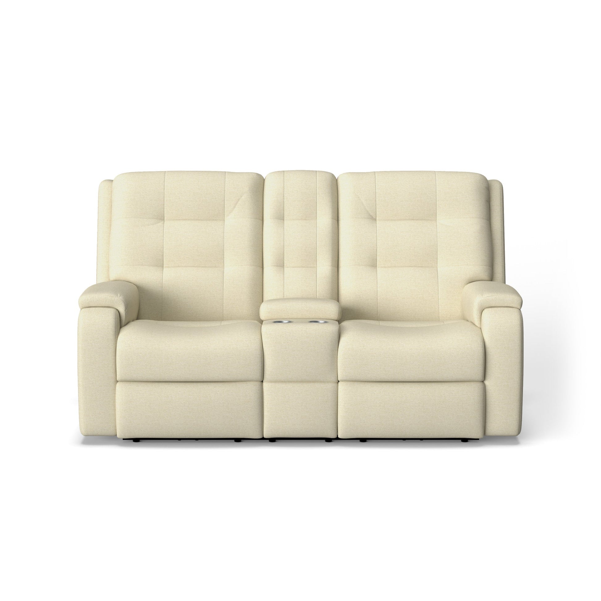 Stay comfy with everything you need for streaming, gaming or relaxing close at hand with the Arlo Power Reclining Loveseat with Console. Using the power controls in either of the arms, you and the person you’re sitting with can easily kick up your feet and recline. USB charging ports in the controls keep devices powered up and ready when you need them. A center storage console features cup holders and offers plenty of space to organize remotes, magazines and more. Comfort-enhancing design details include pull-tufted, triple-divide back cushions for a distinctive look and optimal back support. Contoured seats take pressure off your legs as you sit, while our patented DualFlex Spring System™ provides firmness and flexibility. Rounded pad-over track arms support your forearms—perfect for long hours of gaming or movie watching. Choose from over 250 fabric options to create a look that’s all your own.