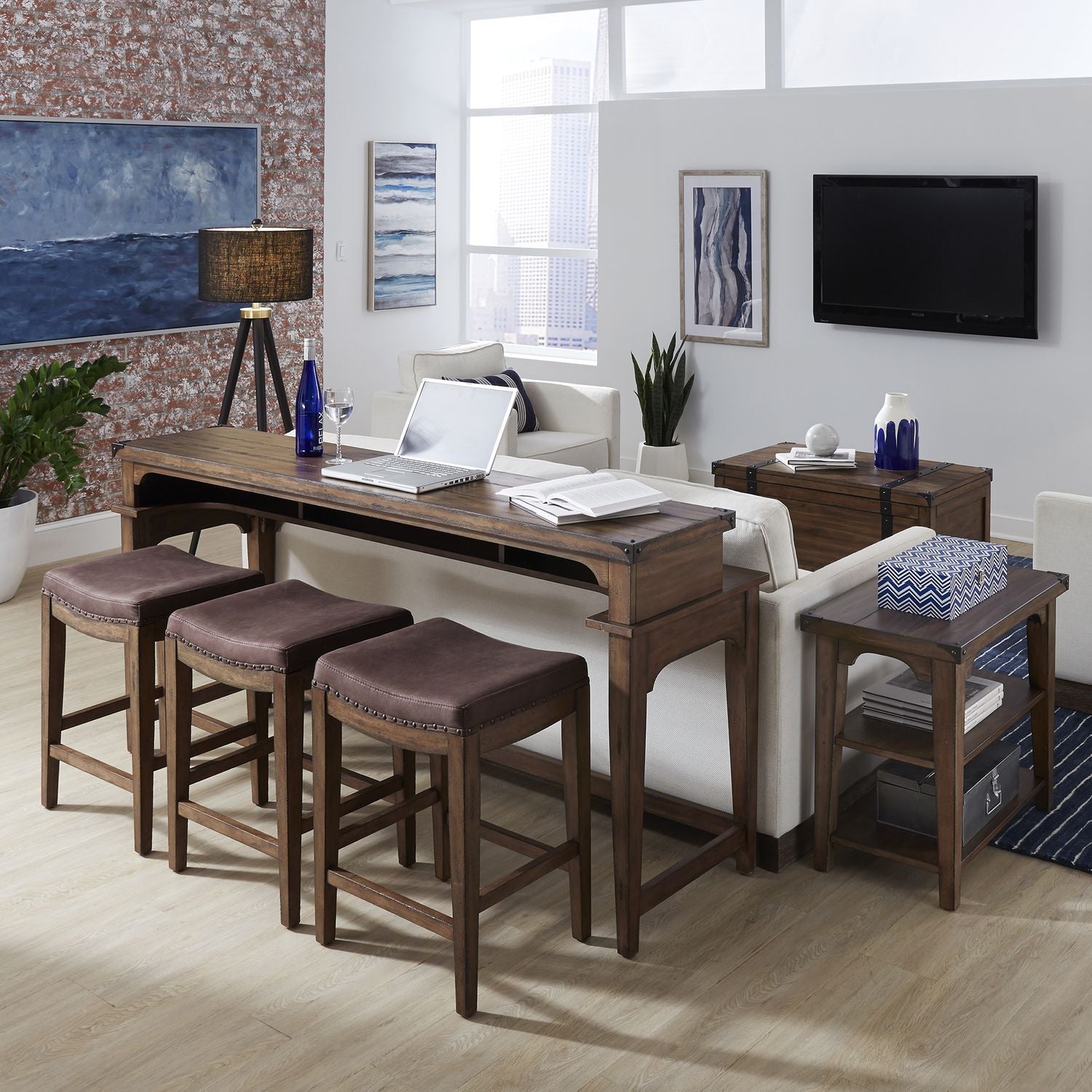 Design possibilities are endless with Aspen Skies works with styles from rustic to farmhouse. Crafted of pine solids and New Zealand pine veneers in a weathered brown finish with metal accent. Features planked tops with metal corner accents and nail heads, cut outs beneath the top for additional storage and saddle style stools upholstered in a brown microfiber material for cleanability with accent nail heads. Perfect behind the sofa or a kitchen nook. Kit consists of one console bar table and three stools. Also available in a russet brown finish.