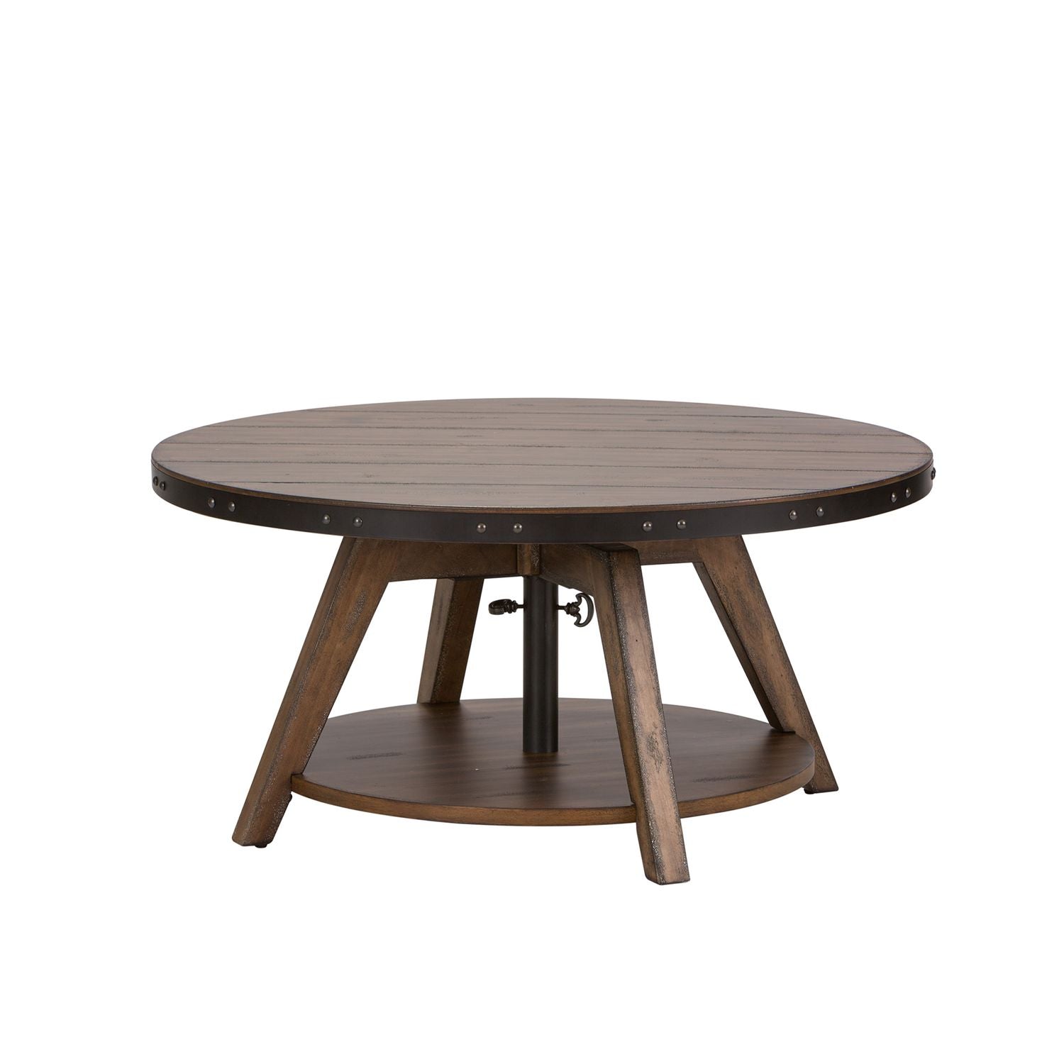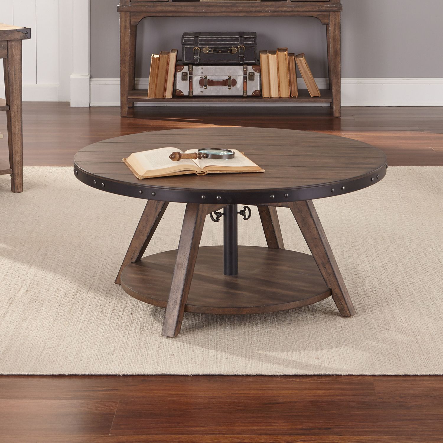 Enhance your space with the traditional Aspen Skies motion cocktail table. Crafted of pine solids and New Zealand pine veneers with metal accents, this piece features a weathered brown finish with gray hang ups, planked top, height adjustability from 16-24”, appealing metal band with nailheads, lower level shelf for additional storage, anchored by a tapered leg design. Also available in an alternat finish, this traditionally designed chair side table would make a great addition to any space.