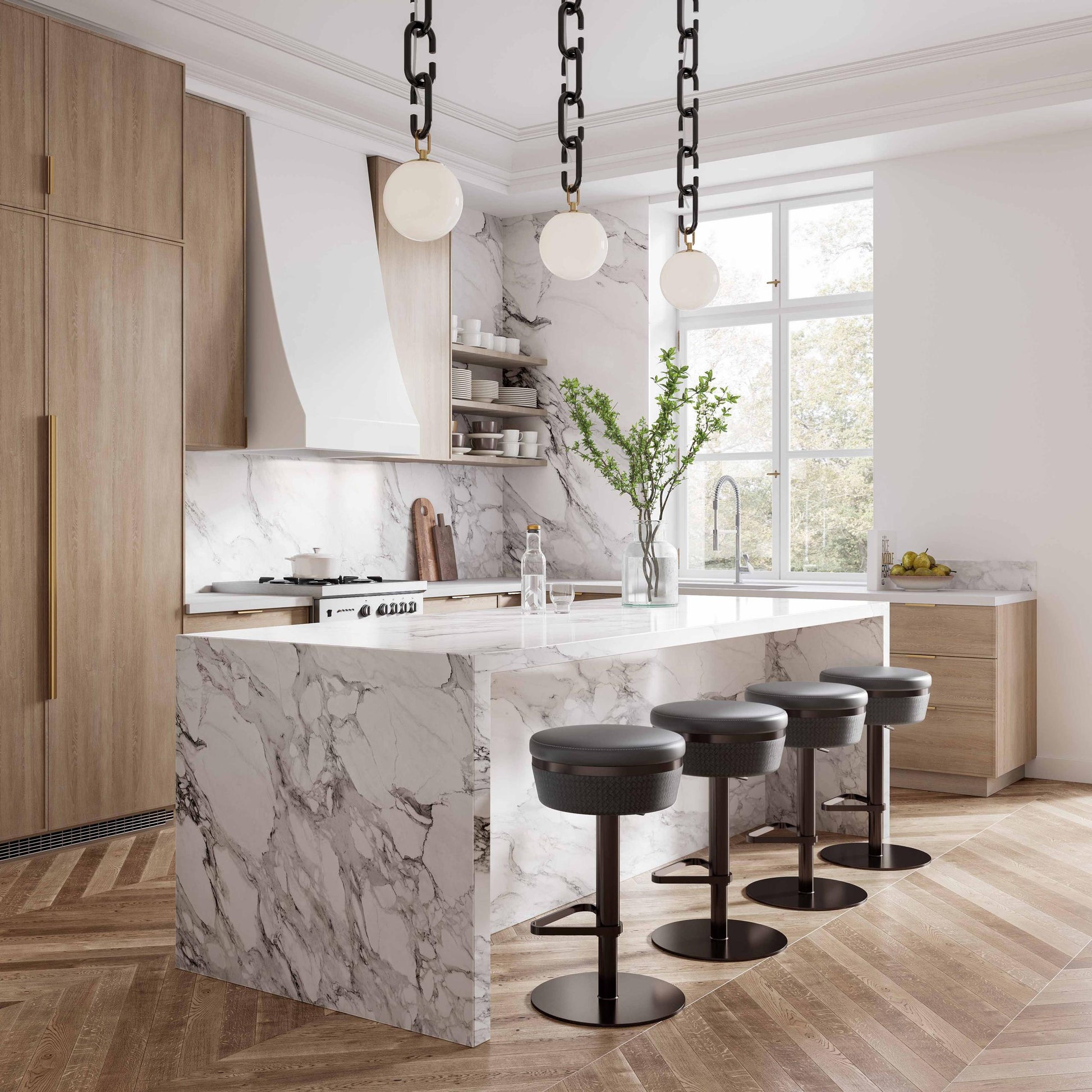 Bringing a minimalistic style with a glam twist to your kitchen space, meet the Astro Stool. The plush foam seating is upholstered in comfortable vegan leather, all accented by a dark grey band and sturdy stainless steel base. This stool is the perfect addition to a contemporary home while adding a subtle dazzle! Available in several upholstery options