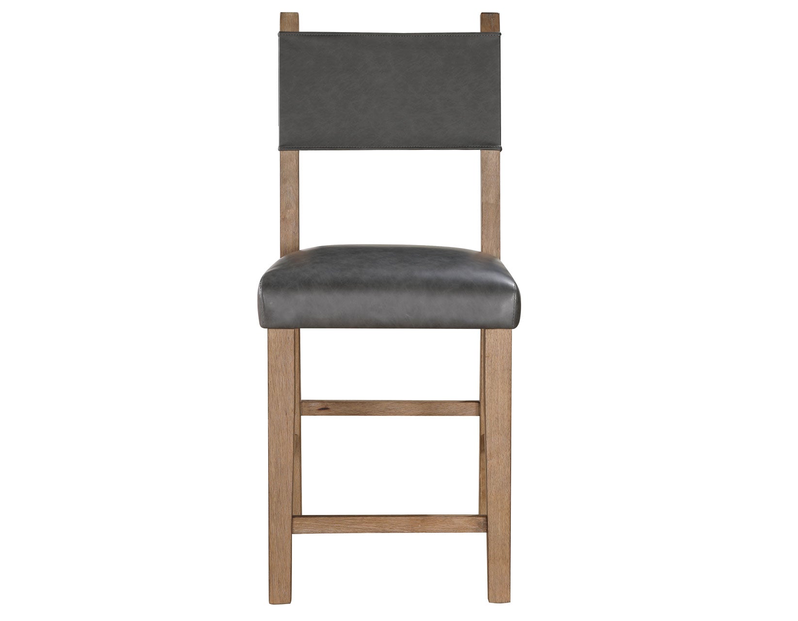 Bring modern lodge charm to your home with the Aubrey Driftwood 5-Piece Counter Dining Set. This stunning set features a 59.5-inch counter table with a robust 1.5-inch tabletop, canted square legs, and eye-catching exposed tenons in a lustrous driftwood finish complemented by black accents. The comfortable gray vegan leather counter chairs, designed for 36-inch counters, feature a 24-inch seat height, solid wood legs, and plush 5-inch cushioning for exceptional comfort. Seating up to six, this compact yet spacious set is ideal for small or medium-sized dining rooms, making for a casual, stylish addition to your home.