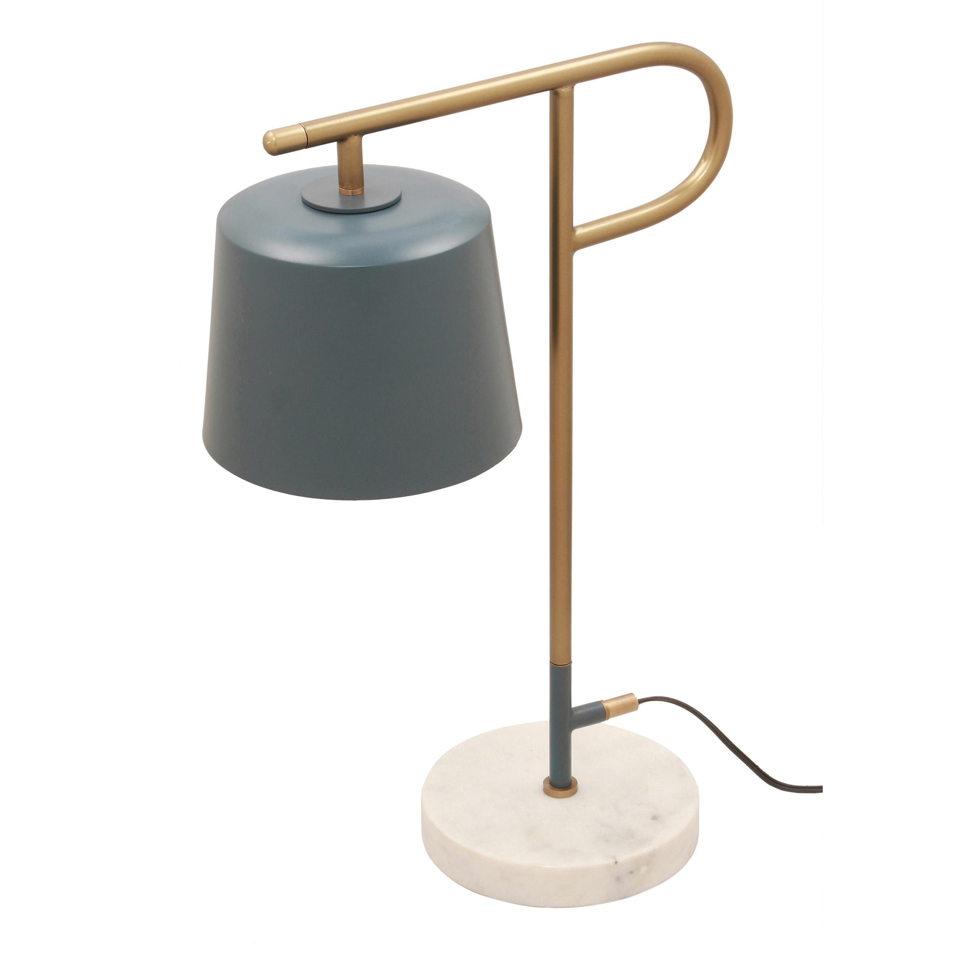 Full of modern appeal, this table lamp flaunts a grey conical shade beautifully offset by its curved brass neck and white marble base.