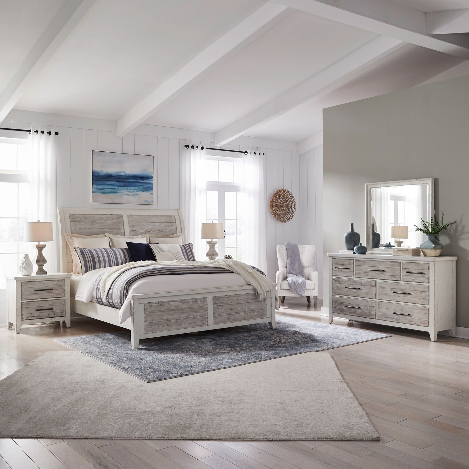 Enhance your bedroom’s charm with the exquisite Backroads king California sleigh bed, dresser, mirror, and nightstand. Crafted with excellence using Poplar solids with paint grade and Spruce veneers, this set features a Weathered White and Parchment Brown finish. The bed features a headboard and footboard adorned with exquisite rolled and wide cap rails respectively, adding a touch of sophistication to any bedroom decor. The cases feature robust block style tops and wide pilasters that gracefully flow into tapered feet, offering a sturdy and elegant foundation. Each drawer front is adorned with high-low veneers, finished in a Parchment Brown with a heavy wire brush technique. This creates a stunning two-tone effect when contrasted with the Weathered White finish, adding depth and character. Accentuating the rustic charm, Burnished Bronze bar pull hardware adorns each drawer, providing a tasteful contrast against the finish. Enjoy smooth and quiet operation with soft closing drawer guides, ensuring effortless access to your belongings while maintaining a serene bedroom atmosphere. The top drawers are luxuriously lined with premium felt, offering a protective and plush environment for delicate items. Meanwhile, the bottom drawers feature cedar lined panels, imparting a natural, aromatic touch. A built-in charging station on the nightstand includes 2 outlets, 1 USB-A port, and 1 USB-C port, allowing you to conveniently charge your devices overnight without cluttering your space. The mirror frame boasts softly rounded bead molding, delicately outlining the reflective surface with a subtle yet stylish detail. A 1-inch beveled edge around the mirror not only adds a refined finishing touch but also enhances its visual appeal by creating depth and dimension. Attach the mirror to the Backroads 7 drawer dresser with the included bolt on supports. The Backroads king California sleigh bed, dresser, mirror, and nightstand promises both style and durability, making it the perfect addition to your bedroom ensemble.