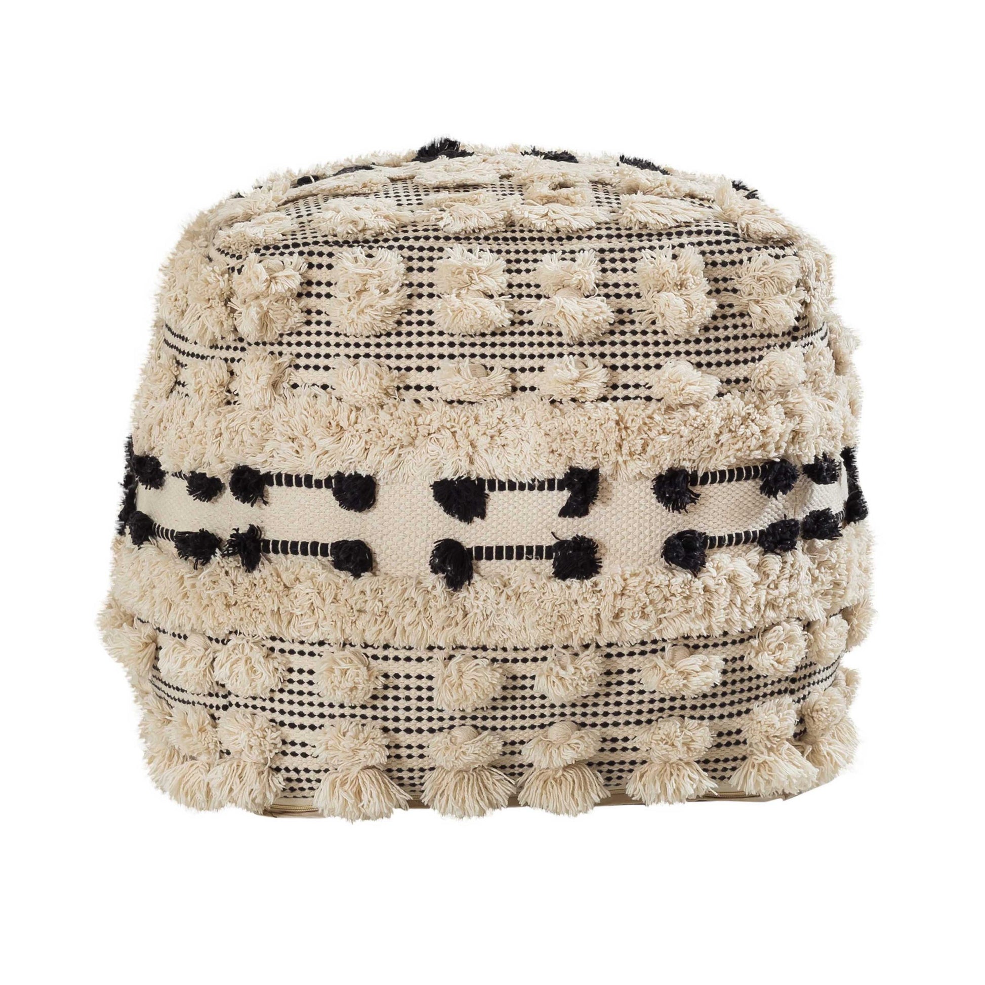 Crafted from handwoven cotton, this textured pouf features a tasseled pattern and a versatile design. Can be used as a seat, ottoman or footrest to enhance any space.