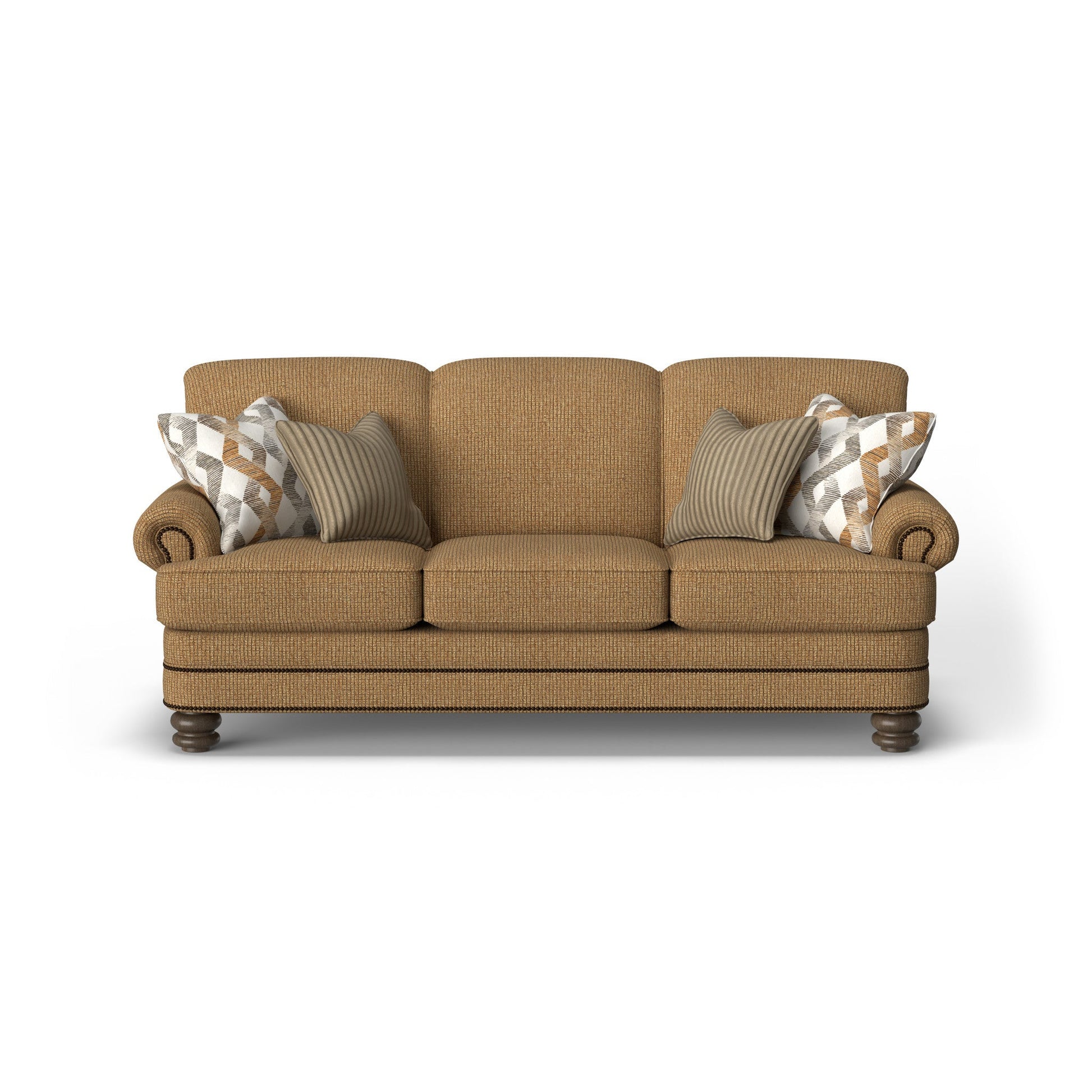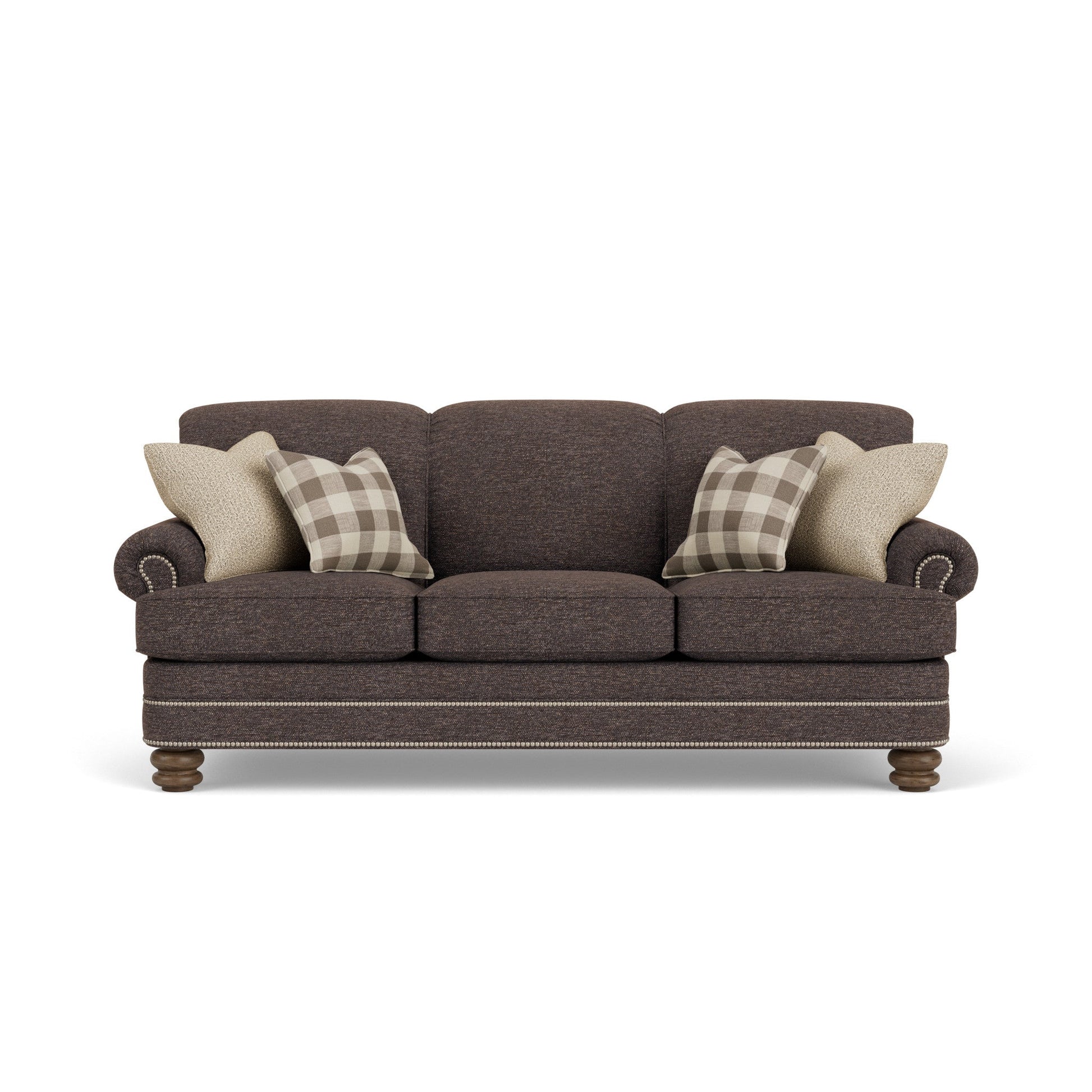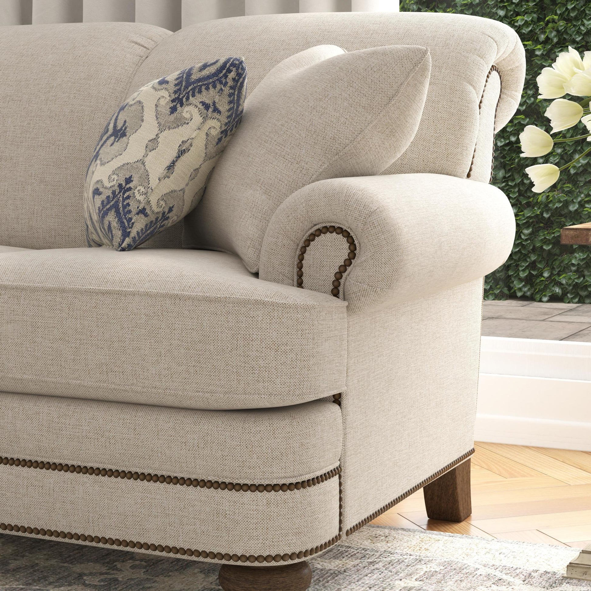 Soft styling complements classic details Bay Bridge has the look of a family heirloom and the feel of brand-new upholstery. Look closer and you'll notice all the vintage details: tightly rolled arms, a rounded front rail, back and side panels lined with welt cord and nailhead trim, and round bun feet. Model Number: 7791-31 Dimensions 37H x 85W x 42L