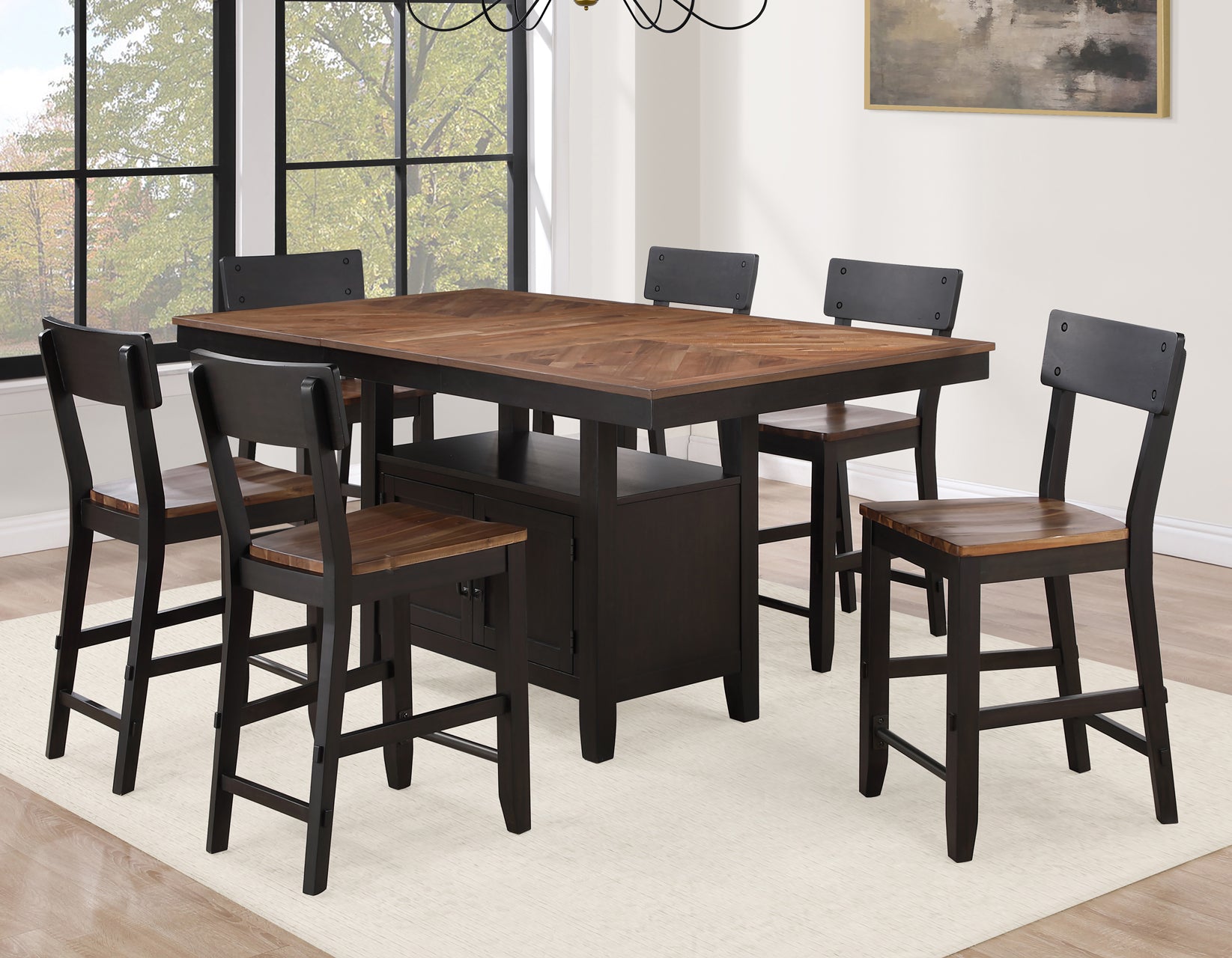 Elevate your dining space with the Bermuda 6-Piece Counter Dining Set, featuring a table, four counter chairs, and a counter bench. Embodying modern farmhouse style with a contemporary twist, this set boasts black and dark acacia finishes over acacia veneers and hardwood solids, exuding both durability and sophistication. The 36-inch high table offers versatility for dining or working, with a convenient 20-inch leaf that seamlessly expands it from a cozy 60-inch setting to a generous 80-inch surface. Tapered legs provide stability and elegance, while the spacious base offers ample storage with dual doors on each side for easy access to essentials. Crafted for both style and functionality, this Bermuda dining set creates a captivating focal point for your space, inviting gatherings and enhancing everyday dining experiences.