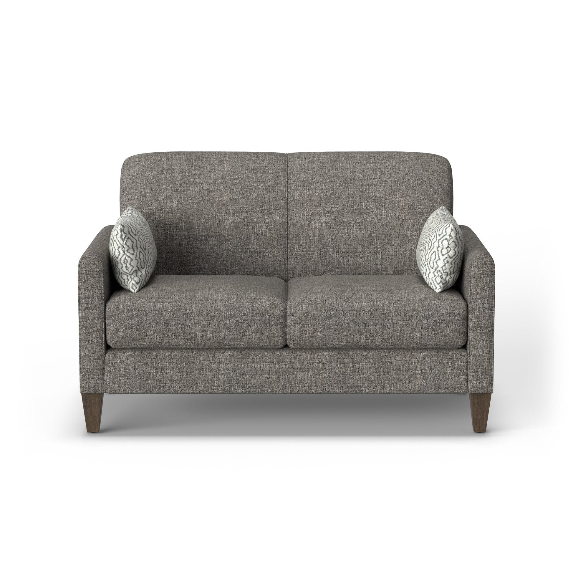 Structured Style Add a touch of cosmopolitan allure to your living space with the Bond loveseat. Its sophisticated mid-century style delivers clean lines with a structured tight-back design and refined welt trim. Mailbox-style arms soften the silhouette, while lumbar accent pillows add style. Square tapered legs, available in three finishes, and the ability to upholster in your choice of fabrics ensures the perfect look. Mailbox curved arms for a soft aesthetic Square tapered legs in your choice of three finishes Includes two lumbar accent pillows in your choice of fabric to match your personal style The patented Blue Steel Spring in the seat provides unmatched support and lasting comfort Sustainably sourced wood frame delivers exceptional durability Tight back design with welt trim for a sleek profile The removable and reversible seat cushions allow you to flip and rotate them for even wear The seat cushions have a high-resiliency foam core that is engineered to maintain its shape over time and contain a layer of recovery foam and a soft fiber top for luxurious comfort Upholstered in your choice of fabric, including those with performance and sustainability characteristics Handcrafted in North America Model Number: 5850-20 Dimensions 36H x 57W x 36L