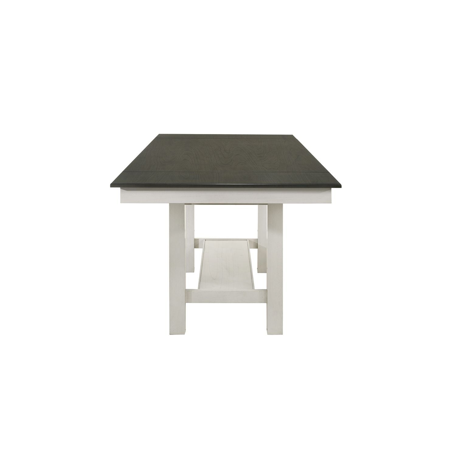 A masterful fusion of rustic charm and contemporary design, the Brook Bay gathering trestle table is destined to be the centerpiece of your dining space. Crafted with excellence using Rubberwood solids and Mindy veneers, this table features a two-tone finish with a Carbon Gray top and a Textured White base. The table boasts two 14-inch refectory leaves on each end, offering seamless expansion and contraction to accommodate gatherings of all sizes. Whether hosting intimate family dinners or entertaining a crowd, this table adapts effortlessly to your needs. The striking contrast between the Carbon Gray tabletop and the Textured White finish of the base adds visual interest and depth to the design, creating a stunning focal point for your dining space. The Carbon Gray top exudes contemporary elegance, while the Textured White base infuses a touch of rustic charm, resulting in a timeless aesthetic that complements any decor style. Square block legs provide sturdy support and lend a modern edge to the design, while the over-scaled center trestle adds a sense of architectural sophistication, anchoring the table with undeniable presence. Elevate your dining space or kitchen area with the Brook Bay gathering trestle table.