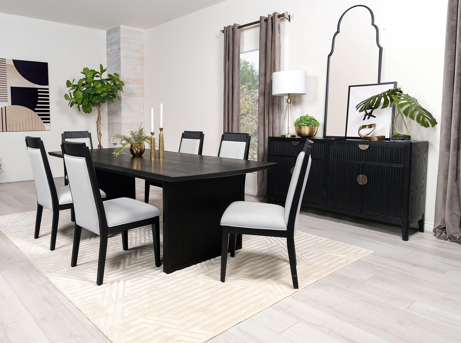 • A sideboard with a modern design aesthetic, featuring clean lines and transitional elements for added versatility