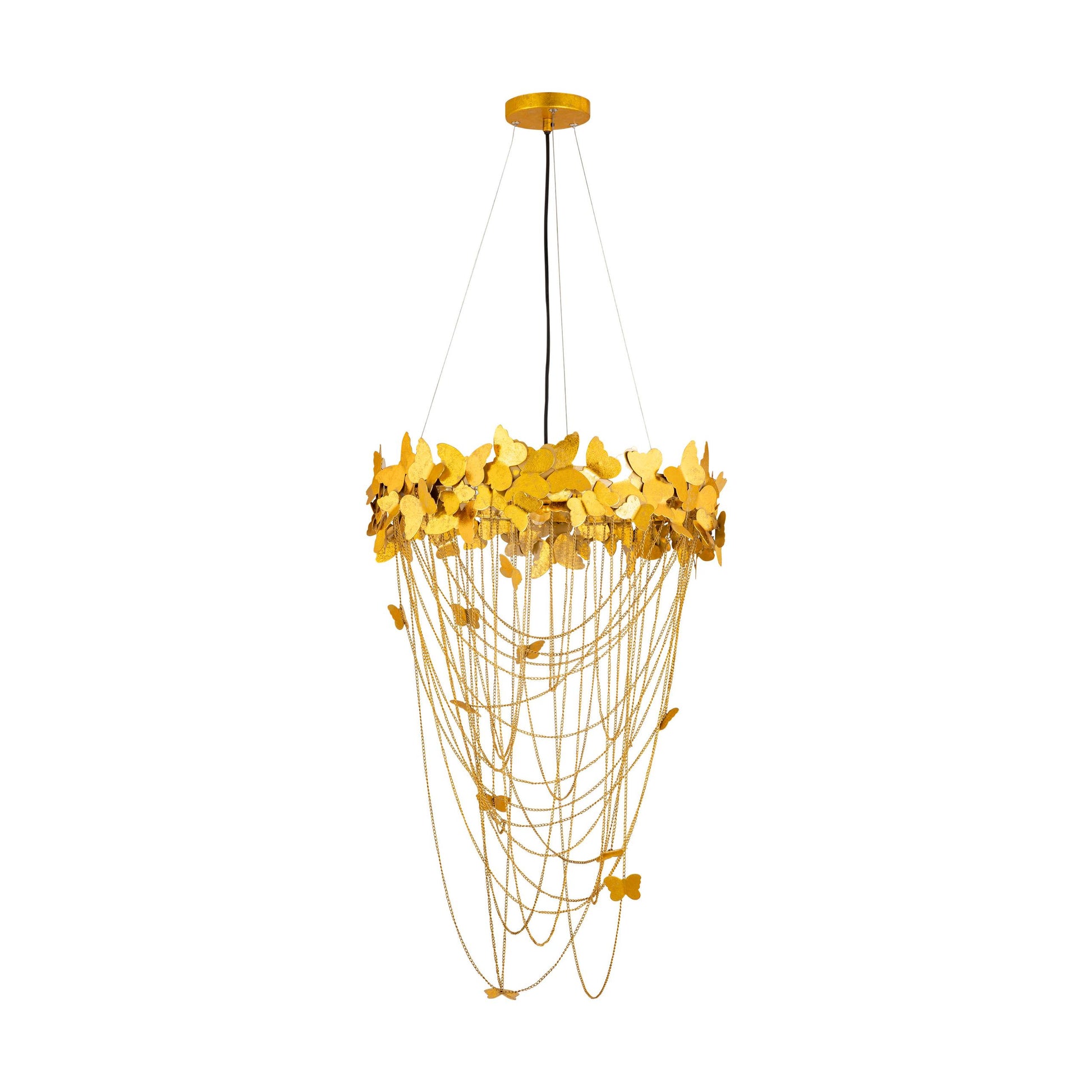 Framed by handcrafted butterflies, this chandelier brings fantasy to your reality. Delicate hanging iron chains accented by fluttering gold butterflies, all come together to create a truly unique piece. the Butterfly Chandelier is sure to elements of texture and dreaminess to your space.