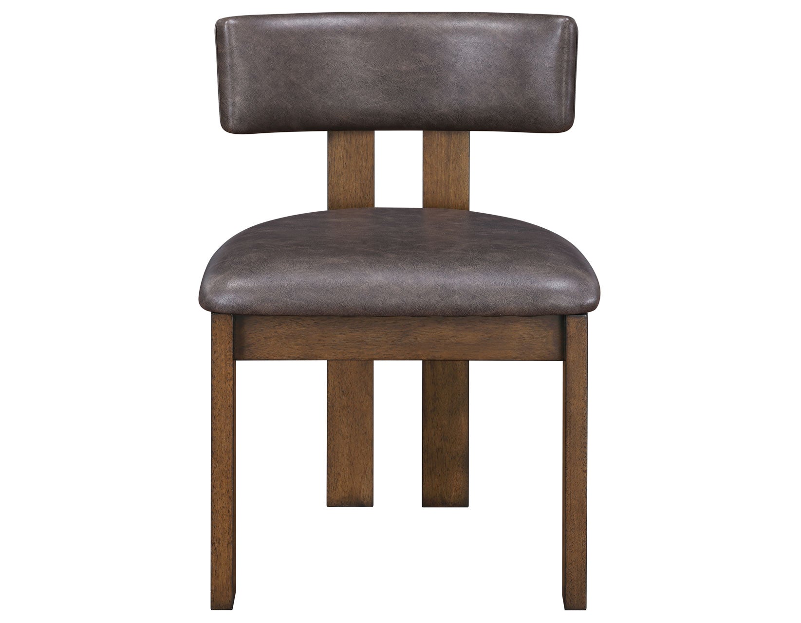 The Cambridge Side Chair blends clean, modern lines with warm, rustic appeal. Crafted from solid Asian hardwoods with a burnished chestnut finish, the chair features a comfortably padded seat and curved backrest upholstered in rich, dark brown vegan leather. The supple faux leather offers the look and feel of genuine hide with added durability and easy care. Its minimalist silhouette and earthy tones make it a versatile choice for dining rooms, game tables, or casual seating areas—perfectly complementing both contemporary and transitional décor.