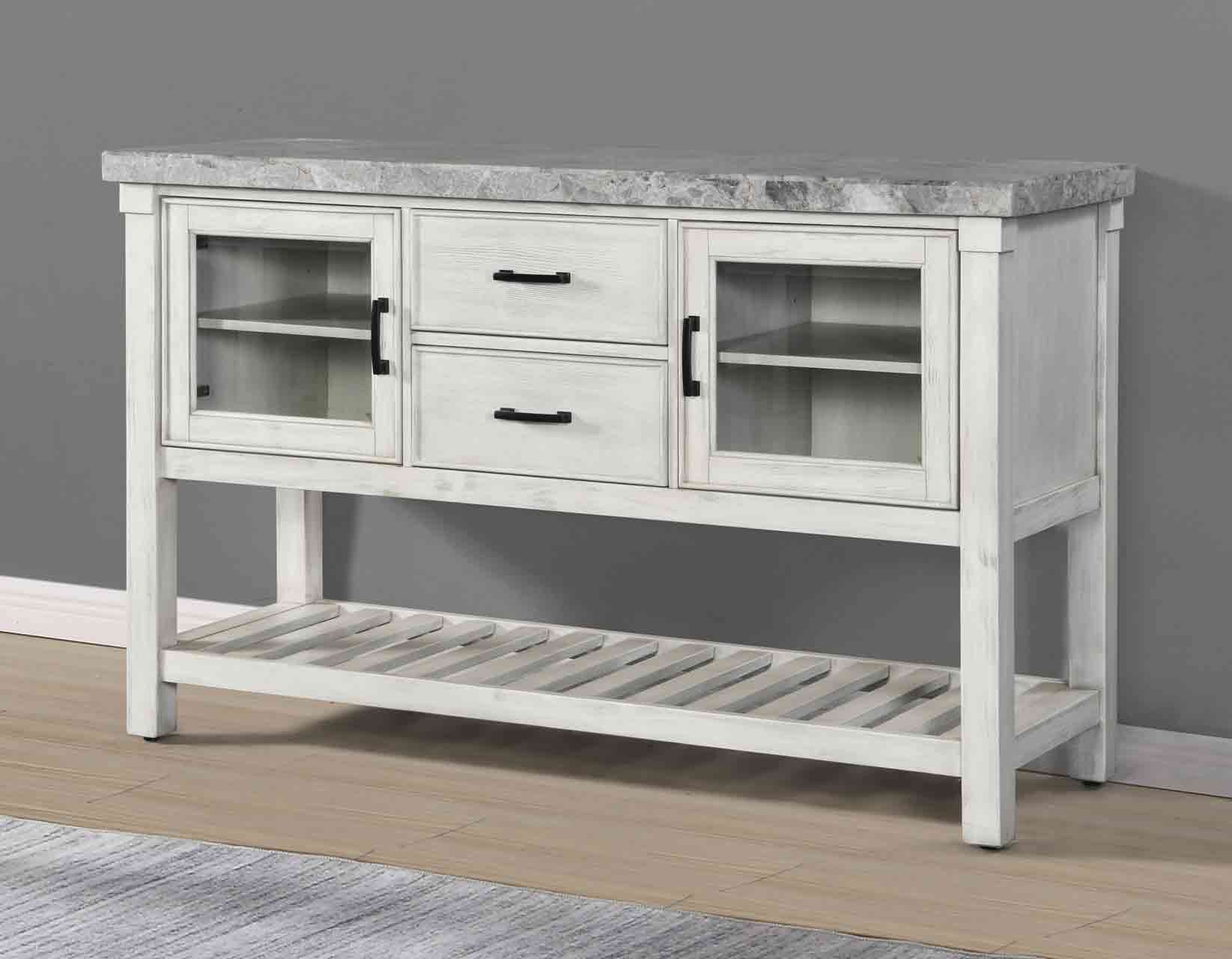 A casually elegant Server in a neutral palette, Canova fits the bill as a dining companion piece. A Cathedral White wood finish pairs beautifully with the solid gray marble veneer in a piece that can be used in classic, contemporary or farmhouse decors. Glass doors allow for a display area or can be used for electronics and remotes in an entertainment package.