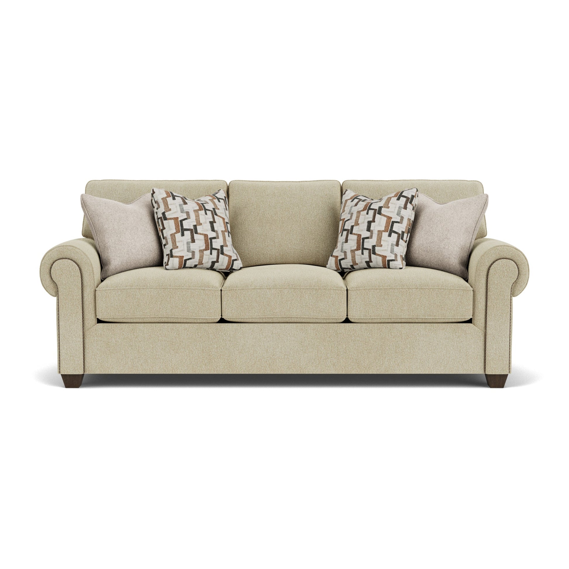 A unique wrap-around padded armrest on Carson’s large-scale rolled arm is highlighted with pleats and welt cording. Optional nailhead trim tightly spaced lines the exposed arm fronts for a fun, visual effect. Relax into Carson’s overstuffed seat and back cushions after a long day and feel the stress melt away.