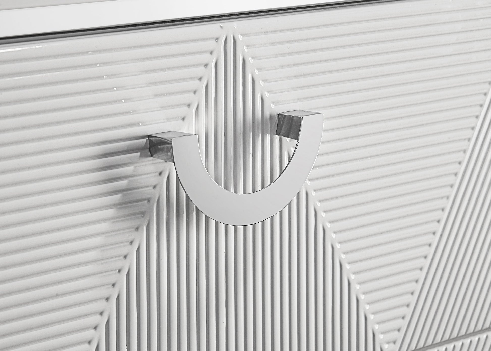 • Six-drawer dresser in white high gloss finish with geometric ribbed drawer front textures