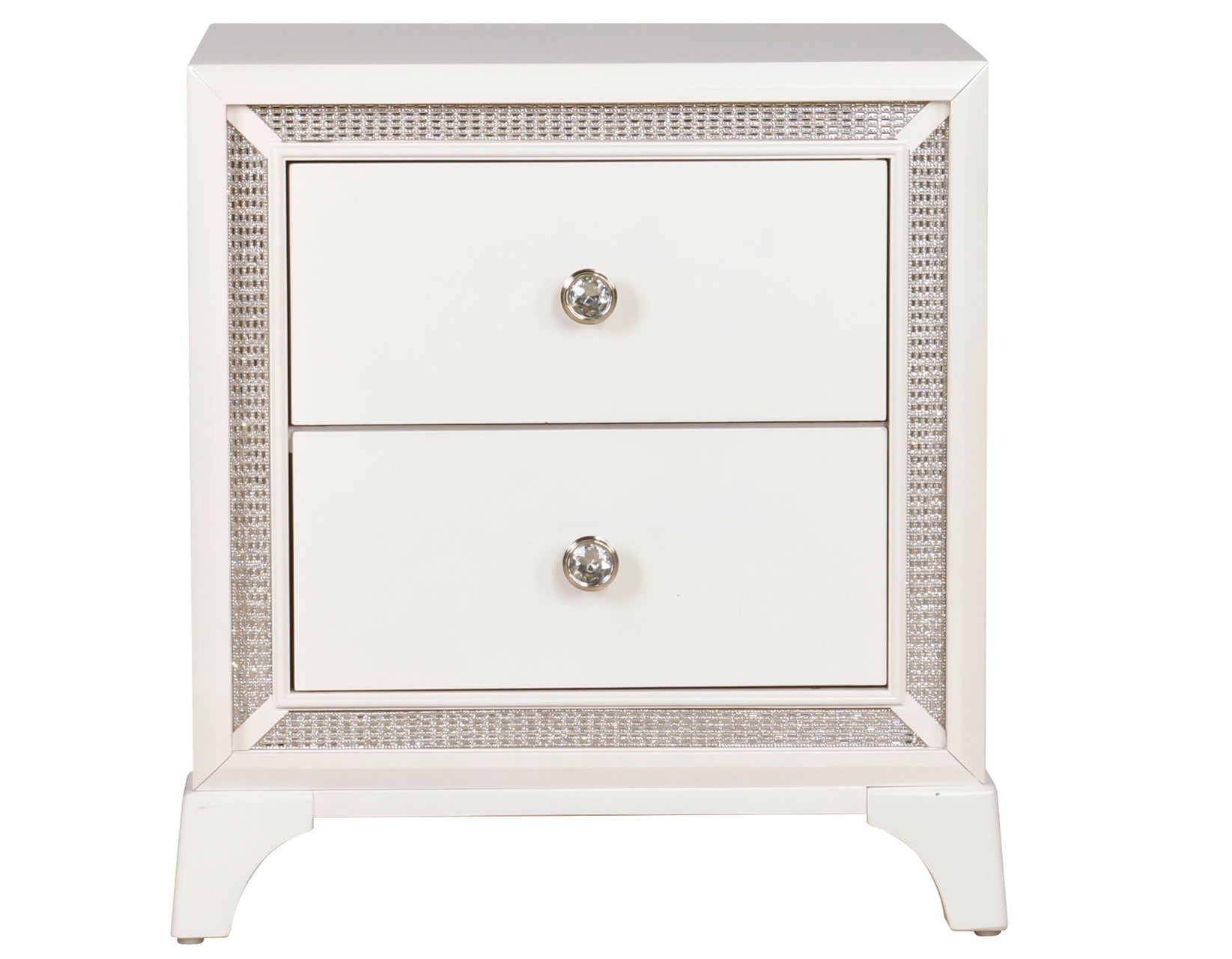 Bring a touch of ultra-glam to your space with the shimmering beauty of the Cassie 2-Drawer Nightstand. Its pearl finish and crystal-inlaid hardware exude sophistication, while the dazzling crystal border lights up with the flip of a switch, transforming the room with a soft, enchanting glow. Acting as both a stylish piece and a convenient night light, this nightstand seamlessly blends luxury with sparkle. The spacious two drawers offer ample storage with a felt-lined top drawer to protect delicates, making it the perfect balance of form and function. Ideal for those who want to elevate their bedroom with a touch of glamour.