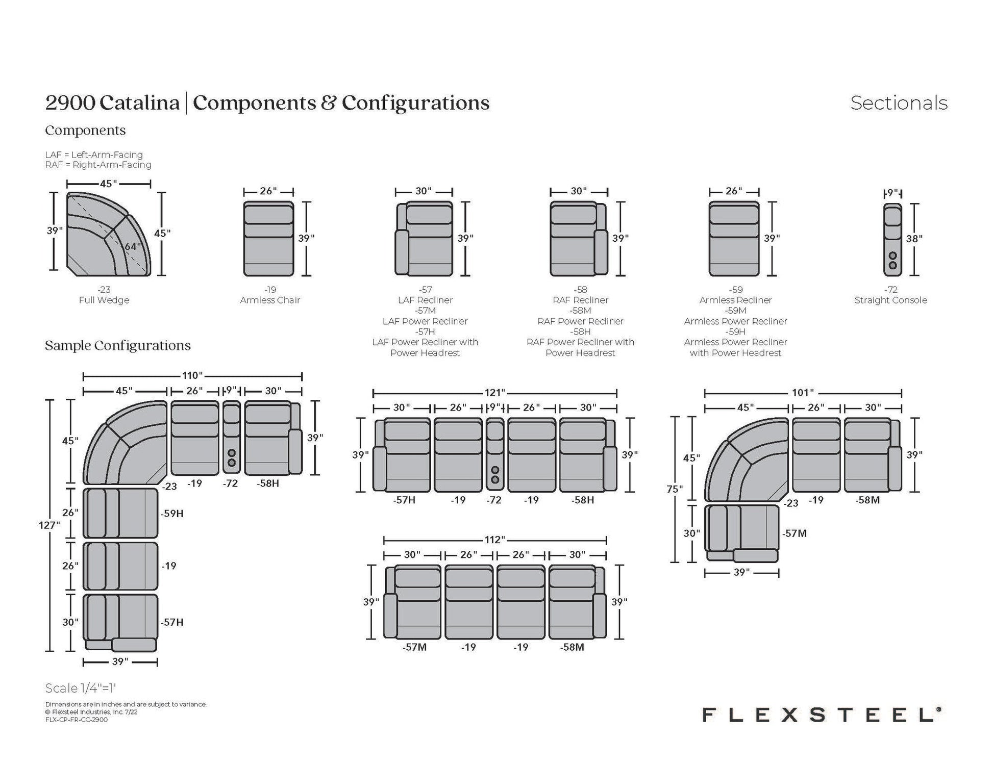 Modern Ease Contemporary-styled comfort invites all-day lounging with the Catalina reclining sectional. Easily recline back and unwind with the pull of a handle in the arm. Catalina’s deep-set back wings and sloped arms offer a sleek aesthetic for living spaces, while contoured seats, fully padded footrests and divided back cushions provide support for complete relaxation. A clean, transitional design Padded, soft sloped track arms Choose from six modular components to build a sectional that fits your space The straight console contains two cupholders for drinks Adjust from an upright to a fully reclined position by opening the handle in the arm Sustainably sourced wood frame delivers exceptional durability Contoured, high-density foam seat cushions provide lasting, everyday comfort and support Upholstered in your choice of more than 250 select fabrics, including those with performance and sustainability characteristics Handcrafted in North America Model Number: 2900-SECT Dimensions